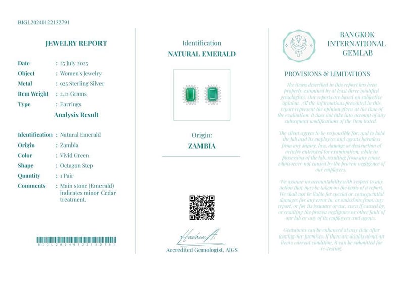 NATURAL ZAMBIAN EMERALD EARRINGS ON 925 SILVER - WITH DIGITAL CERTIFICATE ONLY Gemstone : Natural Zambian EmeraldCertificate (Digital): Bigl20240122132791Item Total Weight : 2.21 GramsMain Stone Color : Vivid GreenSize : Comments : Main Stone (Emerald) Indicates Minor Cedar Treatment.✻ Verify Report Online At Www.Bangkokinternationalgemlab.Co Condition: Good - Refer Images 01611137+22