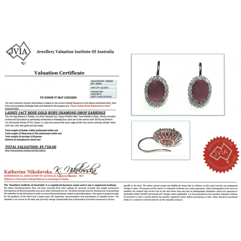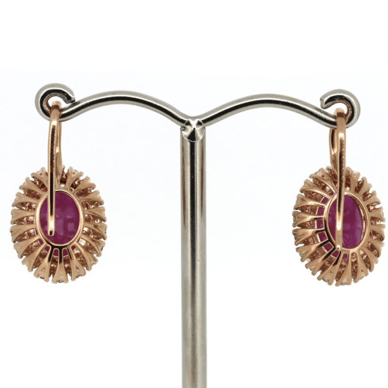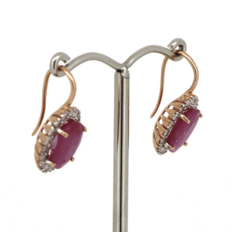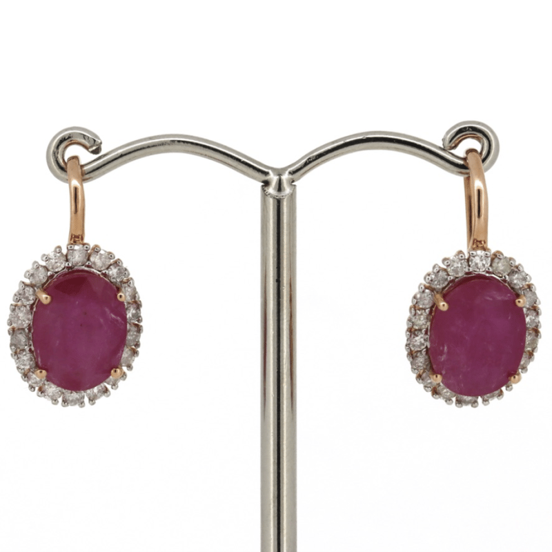 The Design Features, 2 Oval Faceted Cut, Medium Deep Pinkish-Red, Rubies (5.84Ct Tsw, Included, Enhanced), Claw Set. Surrounding The Centres In Halos Are, 36 Round Brilliant Cut, Diamonds (0.75Ct Tdw, J-L Colour, P1-P2 Clarity), Claw Set. The Earrings Have Shepherd Hooks.