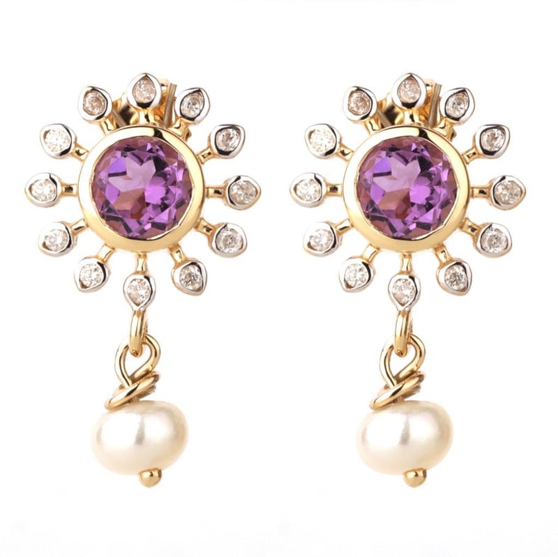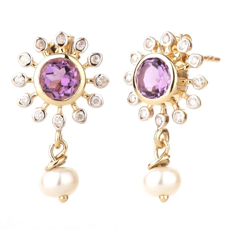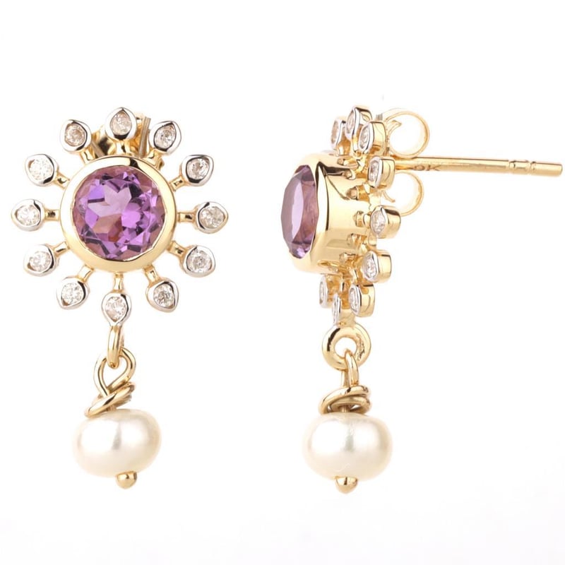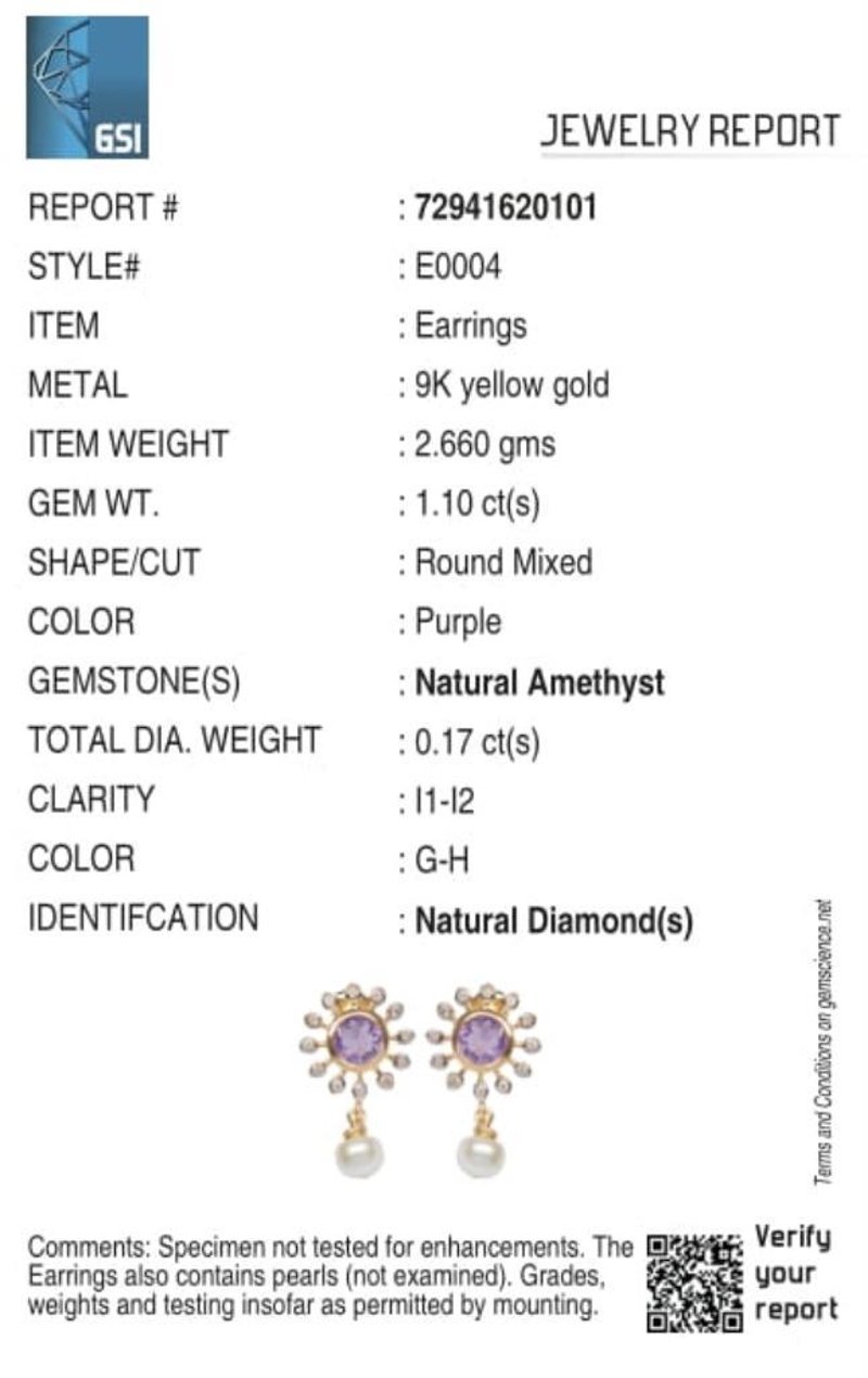 9CT YELLOW GOLD NATURAL AMETHYST / NATURAL PEARL & DIAMOND EARRINGS Weight Of The Item: 2.66 GFineness Of Metal(S): Yellow Gold 9KtThe Earrings Consists Of (2) Round Brilliant Natural Amethyst & (2) Round Brilliant Cut Pearl. Surrounding The Main Stones Are Round Brilliant Cut Natural Diamonds.Identification: Natural Amethyst / Natural PearlColor: Purple / WhiteShape: Round Brilliant Cut / Round Faceted CutNo. Of Stone: 4Dimension: 5 Mm X 5 Mm X 3 MmWeight: 1.1 Carats / 1.43 CaratsCut: Very GoodIdentification: Natural DiamondShape: Round Brilliant CutWeight: 0.17 CtsCertificates Are Provided By Gemological Science International (Gsi), An Independent Third-Party Gemological Laboratory Based In The Usa And Recognised Among The Top 10 Gem Labs Globally Condition: Good - Refer Images 0160841+19
