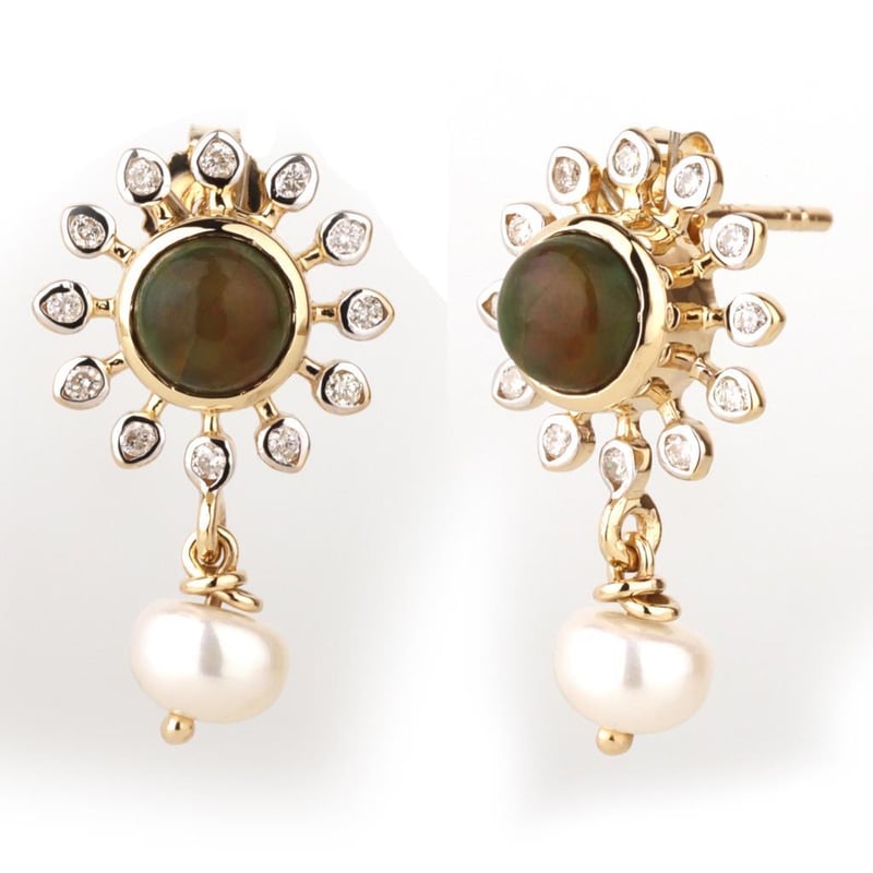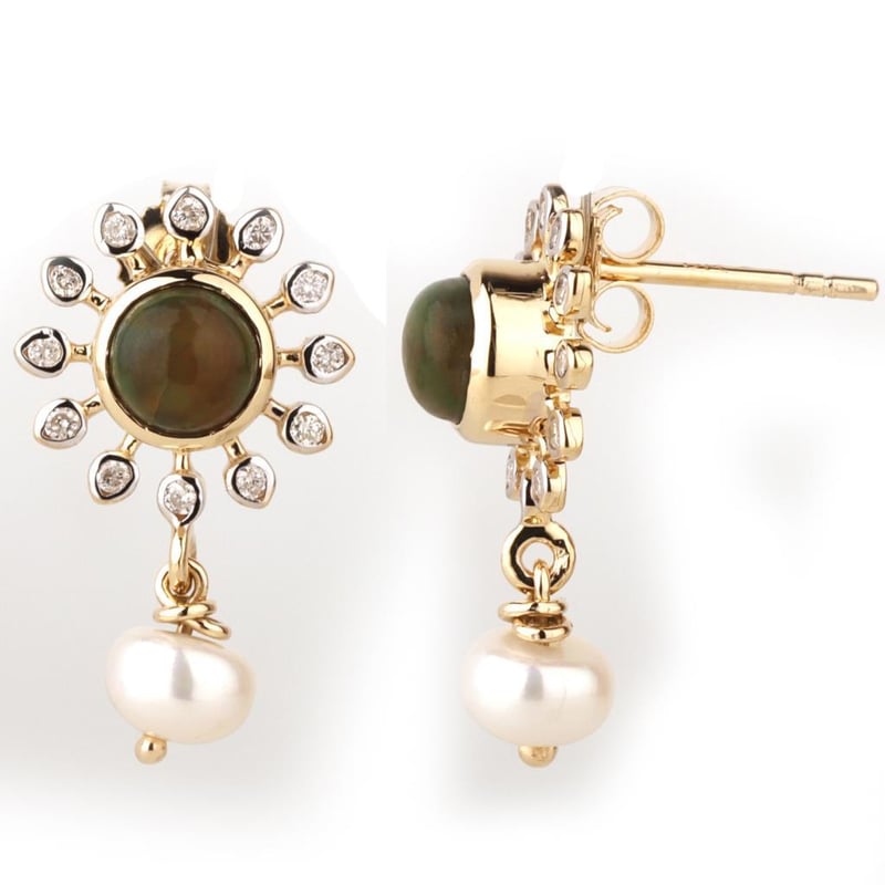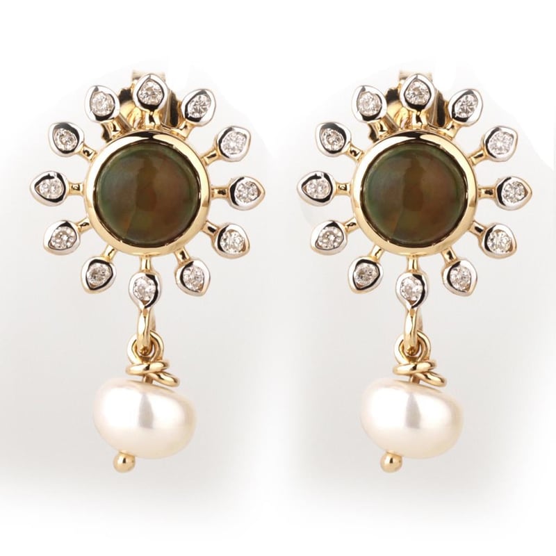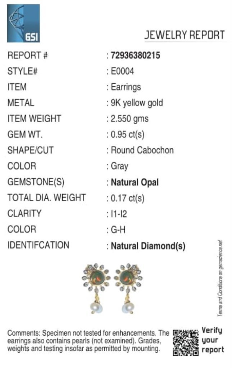 9CT YELLOW GOLD NATURAL BLACK OPAL / NATURAL PEARL & DIAMOND EARRINGS Weight Of The Item: 2.55 GFineness Of Metal(S): Yellow Gold 9KtThe Earrings Consists Of (2) Round Brilliant Natural Black Opal & (2) Round Brilliant Cut Pearl. Surrounding The Main Stones Are Round Brilliant Cut Natural Diamonds.Identification: Natural Black Opal / Natural PearlColor: Black / WhiteShape: Round Brilliant Cut / Round Faceted CutNo. Of Stone: 4Dimension: 5 Mm X 5 Mm X 3 MmWeight: 0.95 Carats / 1.43 CaratsCut: Very GoodIdentification: Natural DiamondShape: Round Brilliant CutWeight: 0.17 CtsCertificates Are Provided By Gemological Science International (Gsi), An Independent Third-Party Gemological Laboratory Based In The Usa And Recognised Among The Top 10 Gem Labs Globally Condition: Good - Refer Images 0160841+20