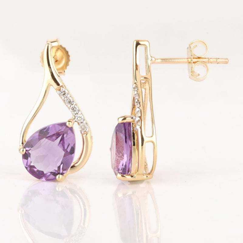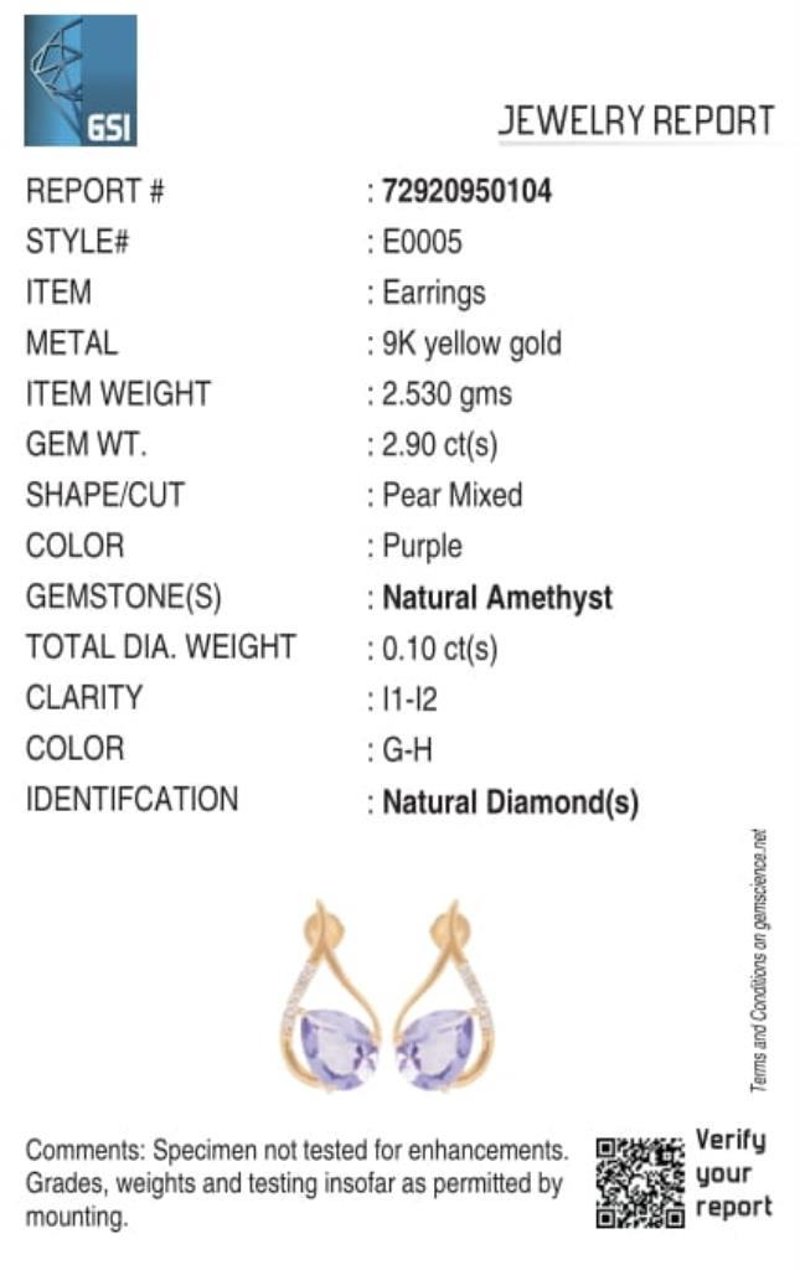 9CT YELLOW GOLD NATURAL AMETHYST & DIAMOND EARRINGS Weight Of The Item: 2.53 GFineness Of Metal(S): Yellow Gold 9KtThe Earrings Consists Of (2) Pear Brilliant Natural Amethyst. Surrounding The Main Stones Are Round Brilliant Cut Natural Diamonds.Identification: Natural AmethystColor: PurpleShape: Pear Brilliant CutNo. Of Stone: 2Dimension: 9 Mm X 7 Mm X 5.4 MmWeight: 2.9 CaratsCut: Very GoodIdentification: Natural DiamondShape: Round Brilliant CutWeight: 0.1 CtsCertificates Are Provided By Gemological Science International (Gsi), An Independent Third-Party Gemological Laboratory Based In The Usa And Recognised Among The Top 10 Gem Labs Globally Condition: Good - Refer Images 0160841+27