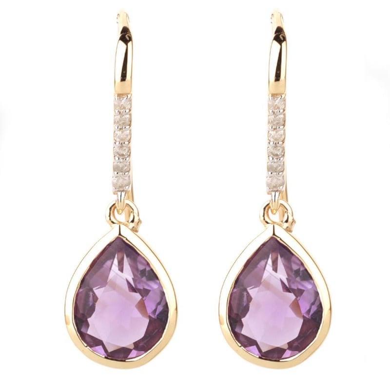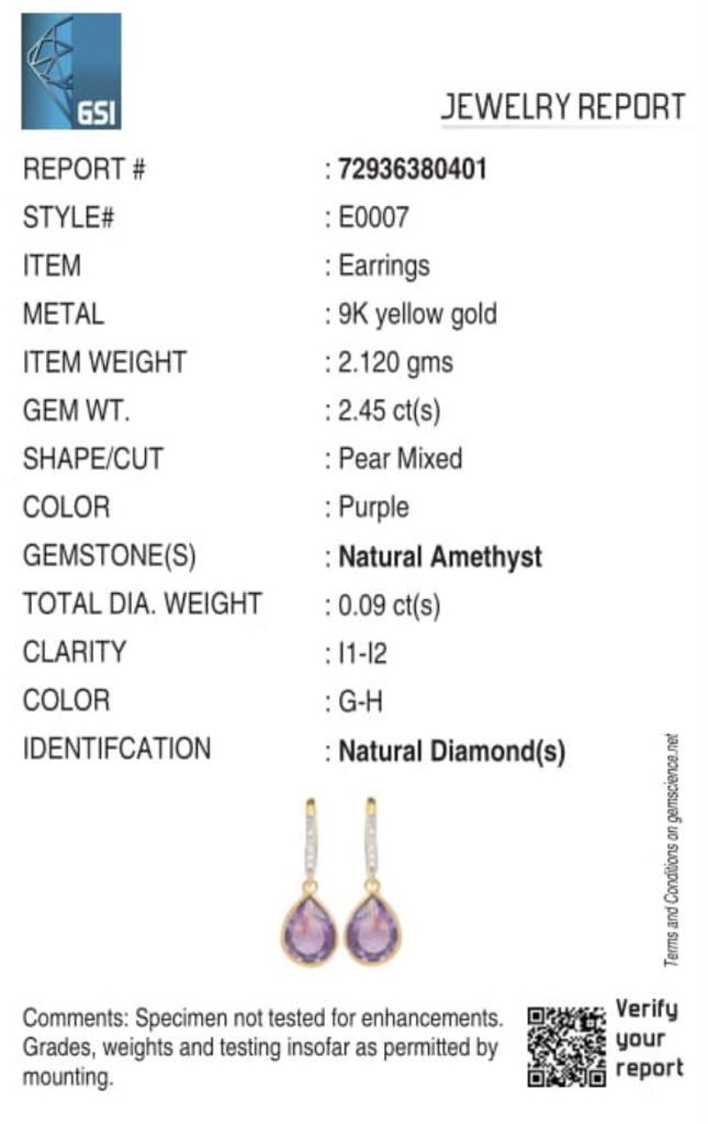 9CT YELLOW GOLD NATURAL AMETHYST & DIAMOND EARRINGS Weight Of The Item: 2.12 GFineness Of Metal(S): Yellow Gold 9KtThe Earrings Consists Of (2) Pear Brilliant Natural Amethyst. Surrounding The Main Stones Are Round Brilliant Cut Natural Diamonds.Identification: Natural AmethystColor: PurpleShape: Pear Brilliant CutNo. Of Stone: 2Dimension: 9 Mm X 7 Mm X 5.4 MmWeight: 2.45 CaratsCut: Very GoodIdentification: Natural DiamondShape: Round Brilliant CutWeight: 0.09 CtsCertificates Are Provided By Gemological Science International (Gsi), An Independent Third-Party Gemological Laboratory Based In The Usa And Recognised Among The Top 10 Gem Labs Globally Condition: Good - Refer Images 0160841+39