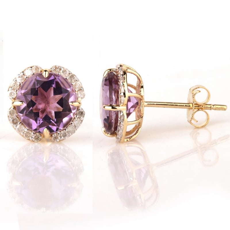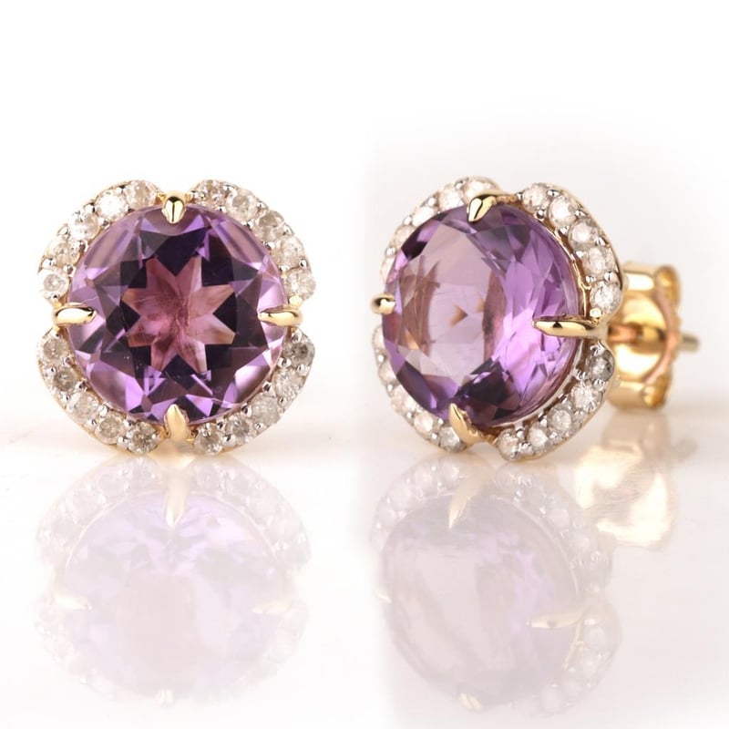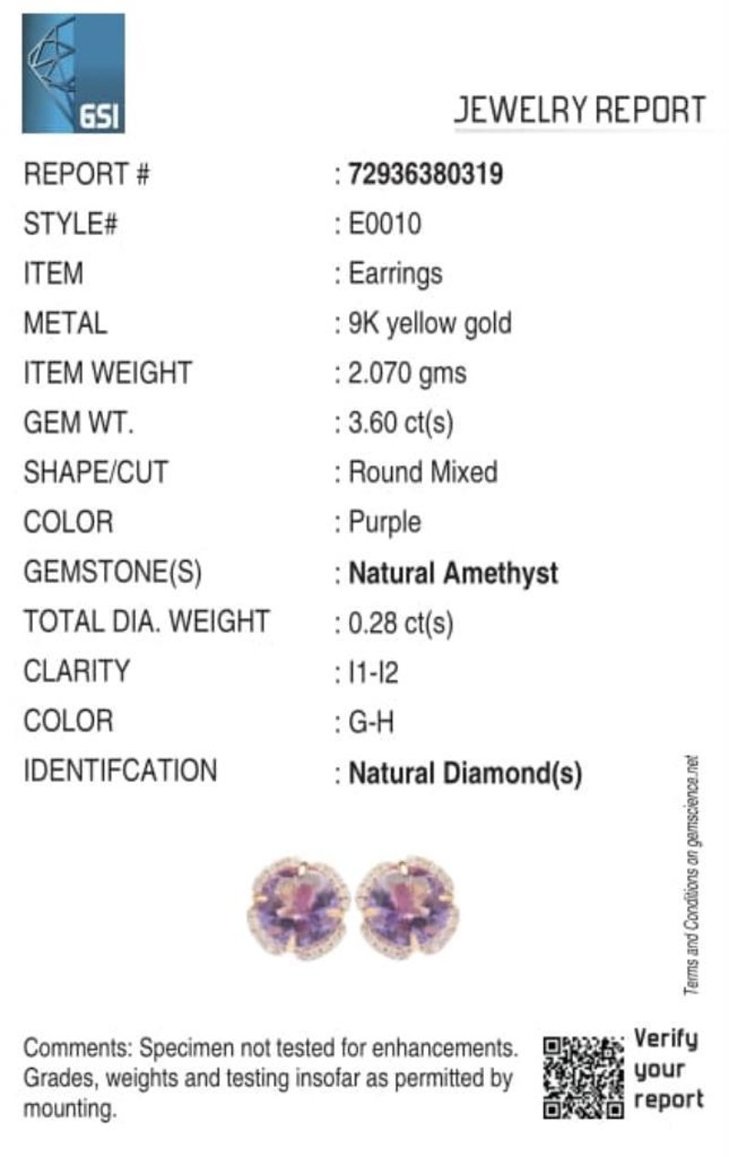 9CT YELLOW GOLD NATURAL AMETHYST & DIAMOND EARRINGS Weight Of The Item: 2.07 GFineness Of Metal(S): Yellow Gold 9KtThe Earrings Consists Of (2) Round Brilliant Natural Amethyst. Surrounding The Main Stones Are Round Brilliant Cut Natural Diamonds.Identification: Natural AmethystColor: PurpleShape: Round Brilliant CutNo. Of Stone: 2Dimension: 8 Mm X 8 Mm X 4.8 MmWeight: 3.6 CaratsCut: Very GoodIdentification: Natural DiamondShape: Round Brilliant CutWeight: 0.28 CtsCertificates Are Provided By Gemological Science International (Gsi), An Independent Third-Party Gemological Laboratory Based In The Usa And Recognised Among The Top 10 Gem Labs Globally Condition: Good - Refer Images 0160841+57