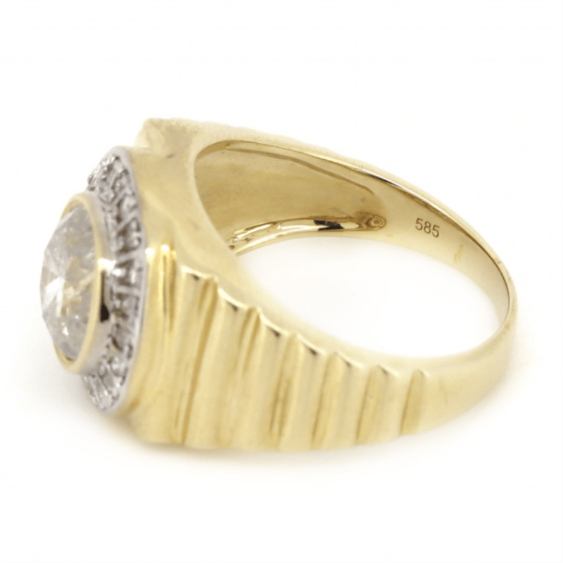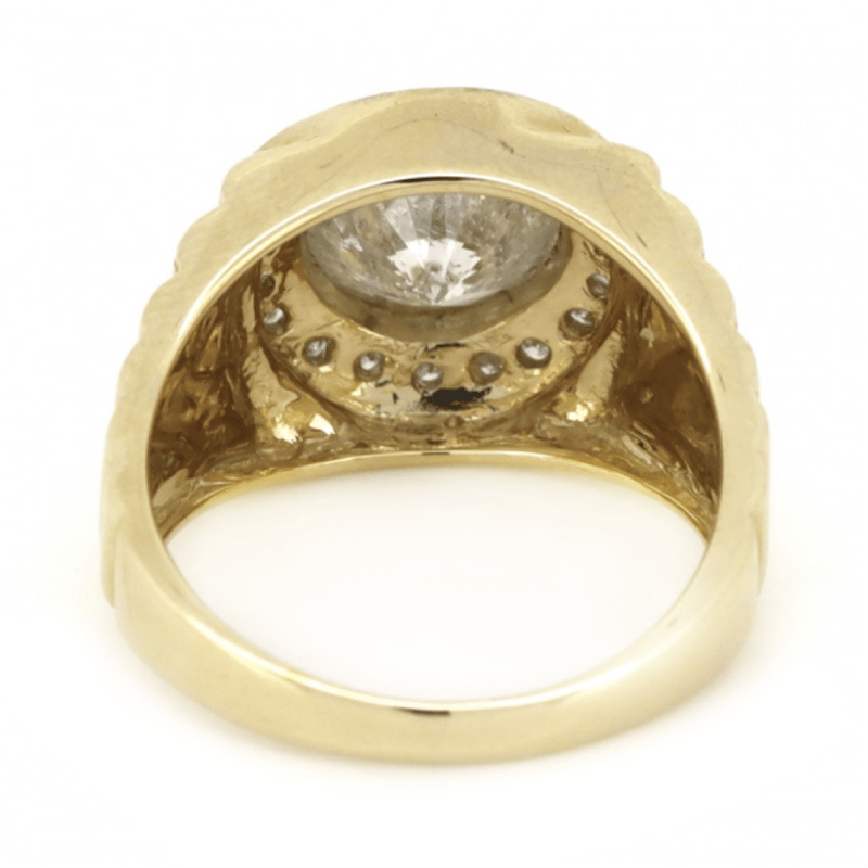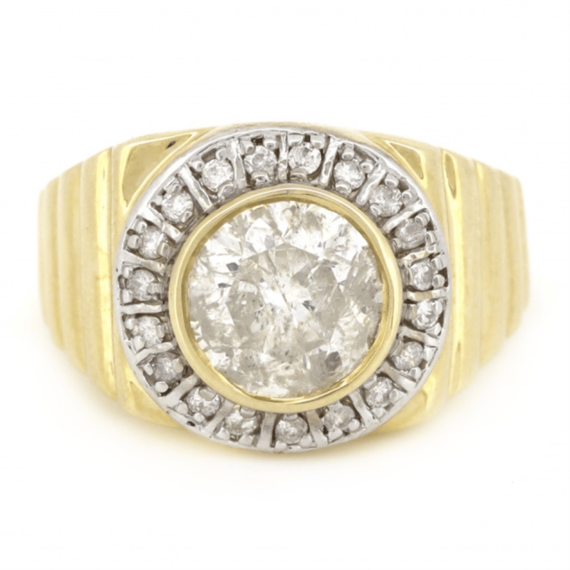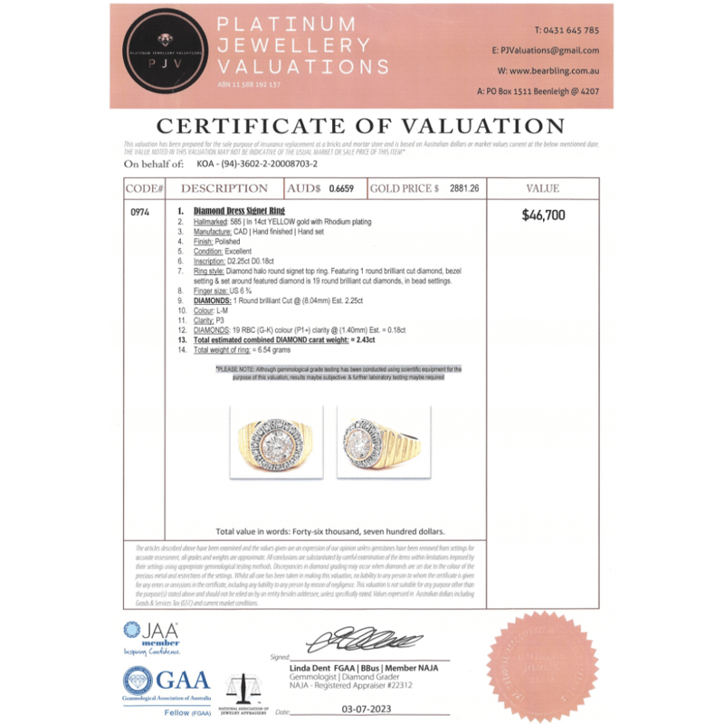 14K YELLOW GOLD AND DIAMOND, GENTS RING. The Centre Features, One Round Brilliant Cut, Diamond (2.25Ct, L-M Colour, P3 Clarity), Bezel Set. Surrounding The Centre In A Halo Are, 19 Round Brilliant Cut, Diamonds (0.18Ct Tdw, G-K Colour, P1+ Clarity), Bead Set. Ring Size L 1/2. 14K Yellow Gold And Diamond, Gents Ring. The Centre Features, One Round Brilliant Cut, Diamond (2.25Ct, L-M Colour, P3 Clarity), Bezel Set. Surrounding The Centre In A Halo Are, 19 Round Brilliant Cut, Diamonds (0.18Ct Tdw, G-K Colour, P1+ Clarity), Bead Set. Ring Size L 1/2. Valuations Provided by an Independent Third-Party Professional Not Directly Associated With Lloyds Auctions at AUD $$46,700.00This valuation has been conducted by an independent third-party professional. The valuation amount is an assessment by the issuing valuer and does not reflect the auction value of the item. Any inquiries regarding the valuation should be directed to the issuing valuer (refer to contact details on the certificate), as Lloyds Auctions has no affiliation or influence over the valuation, the valuer, or the stated amount. Condition: Good - Refer Images 0645838+5387