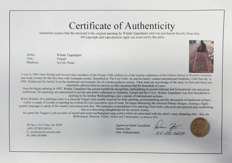 WALALA TJALPALTJARRI C/-1960- Original Acrylic Painting On Canvas Title: ' Tingari ' Image Size: 119cm x 69cm Accompanied By A Certificate Of Authenticity Condition: Good - Refer To Images 488235+13