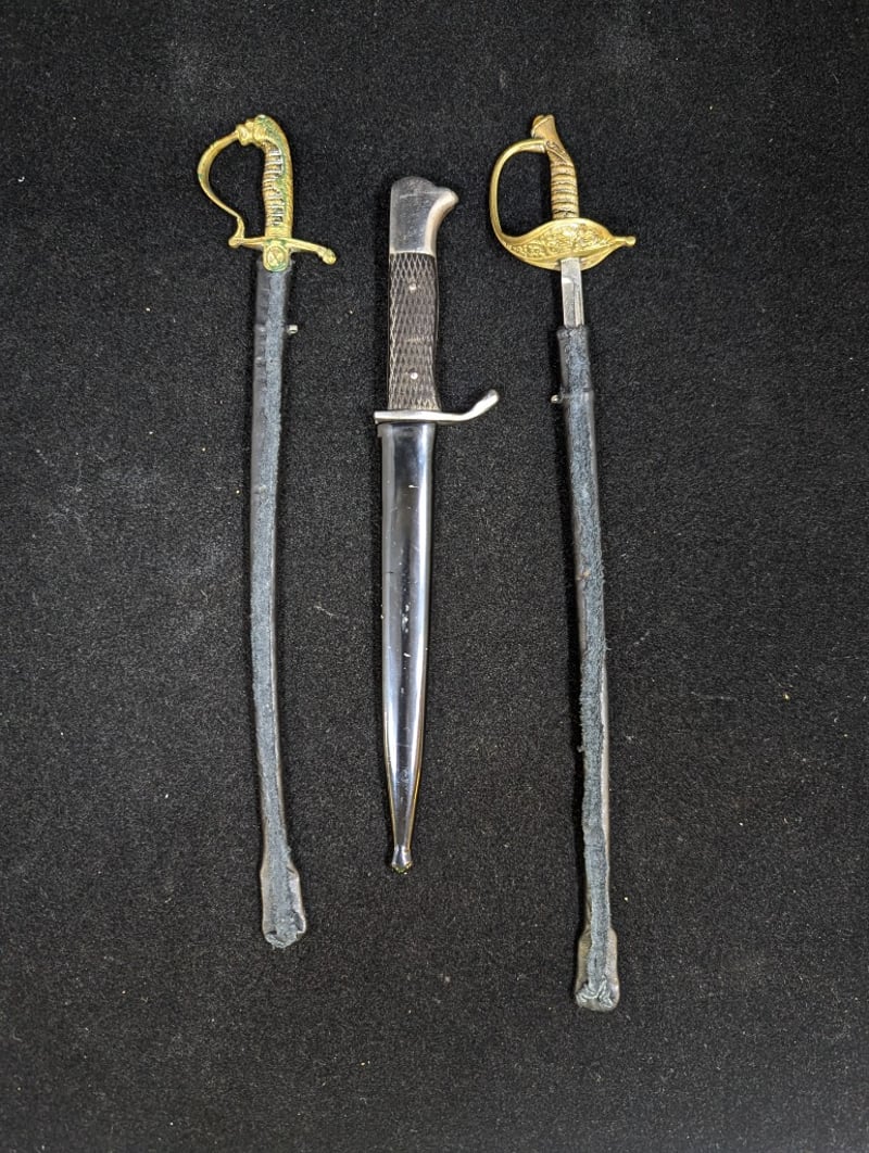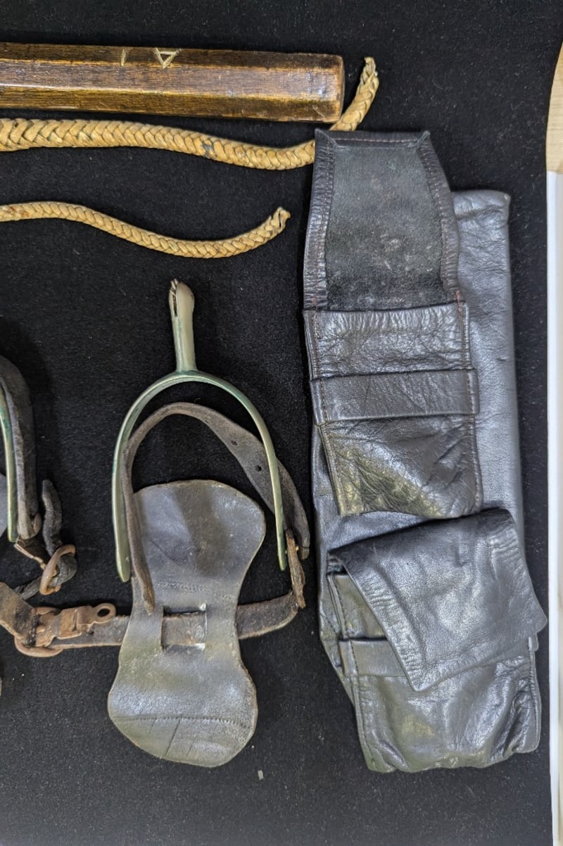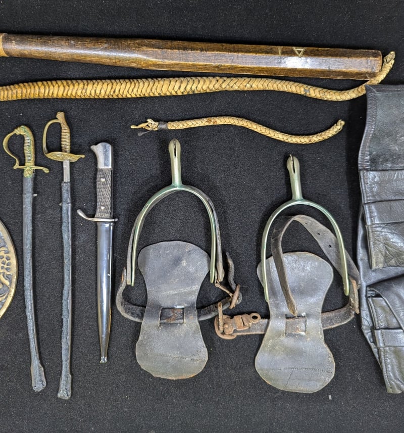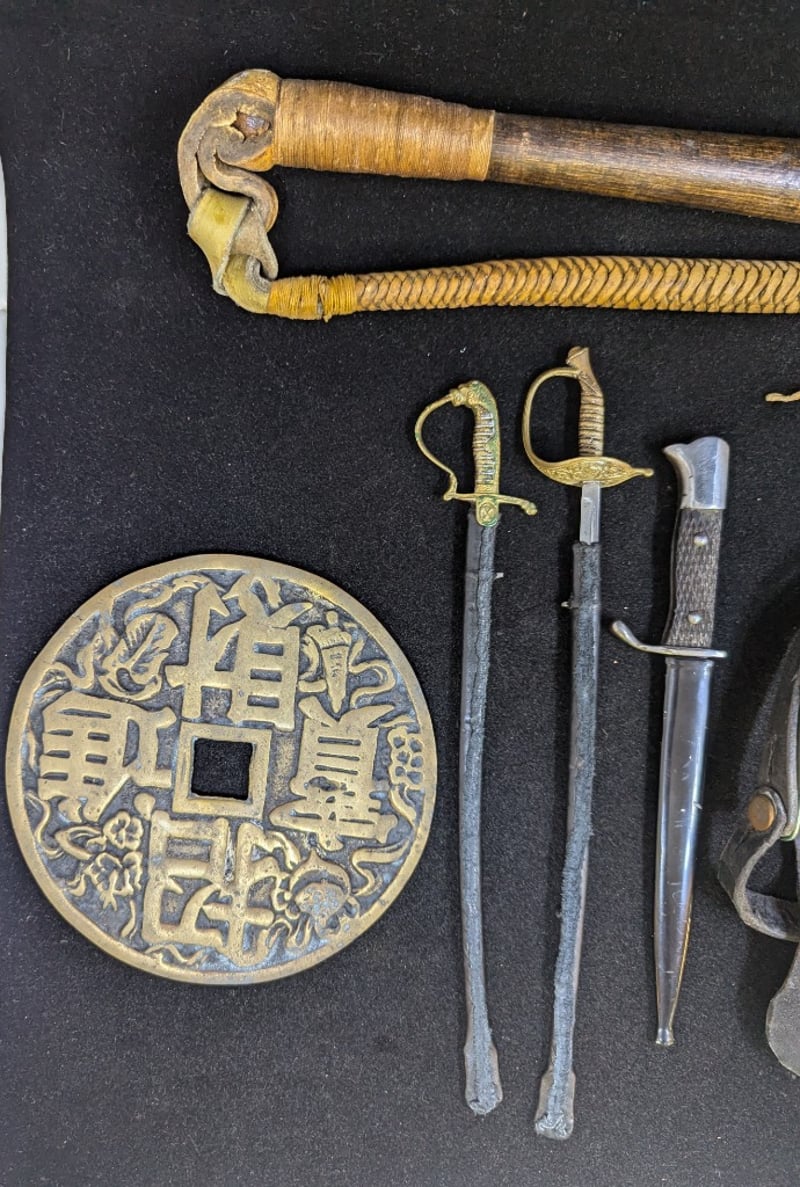 COLLECTION OF HORSE RIDING ITEMS, MINIATURE SWORDS AND CHINESE STYLE MEDALLION