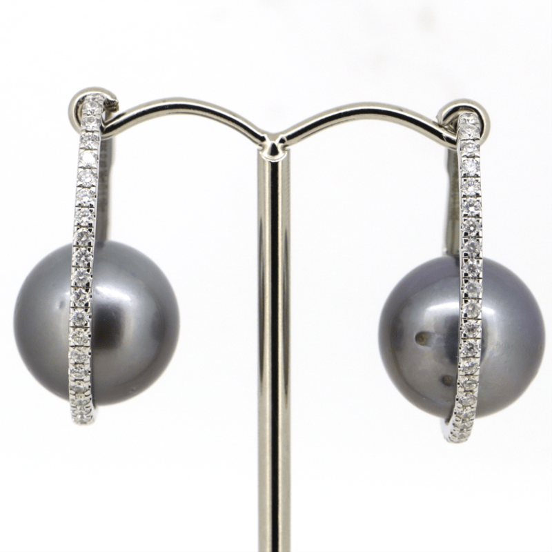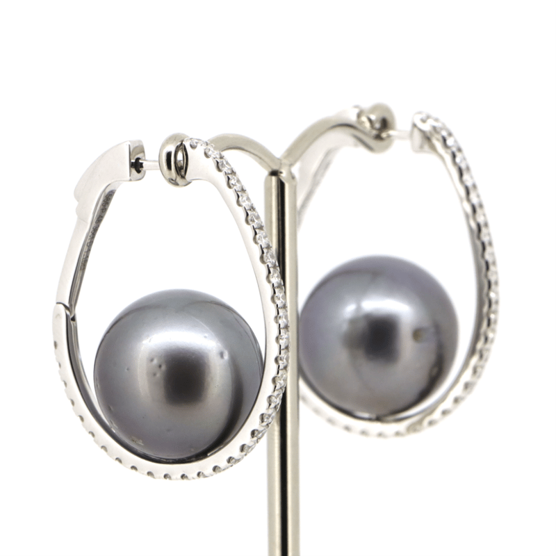 14K WHITE GOLD, GREY CULTURED TAHITIAN PEARL AND DIAMOND, HOOP EARRINGS. The Centre Design Features, 2 Round, Grey With Purple/Green Overtones, Cultured Tahitian Pearls (15.00Mm, Very Few Blemishes), Half Drilled And Capped. Encompassing The Design Are, 66 Round Brilliant Cut, Diamonds (1.18Ct Tdw, G-H Colour, Si1-Si2 Clarity), Bead Set. Earrings Feature Fancy Hinged-Clip Huggys. 14K White Gold, Grey Cultured Tahitian Pearl And Diamond, Hoop Earrings. The Centre Design Features, 2 Round, Grey With Purple/Green Overtones, Cultured Tahitian Pearls (15.00Mm, Very Few Blemishes), Half Drilled And Capped. Encompassing The Design Are, 66 Round Brilliant Cut, Diamonds (1.18Ct Tdw, G-H Colour, Si1-Si2 Clarity), Bead Set. Earrings Feature Fancy Hinged-Clip Huggys. Valuations Provided by an Independent Third-Party Professional Not Directly Associated With Lloyds Auctions at AUD $$33,000.00This valuation has been conducted by an independent third-party professional. The valuation amount is an assessment by the issuing valuer and does not reflect the auction value of the item. Any inquiries regarding the valuation should be directed to the issuing valuer (refer to contact details on the certificate), as Lloyds Auctions has no affiliation or influence over the valuation, the valuer, or the stated amount. Condition: Good - Refer Images 0645838+5363