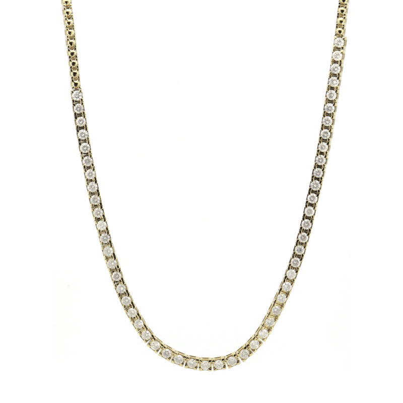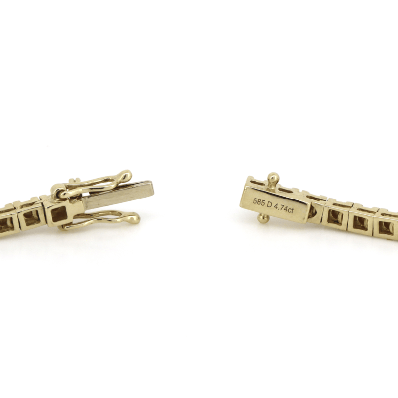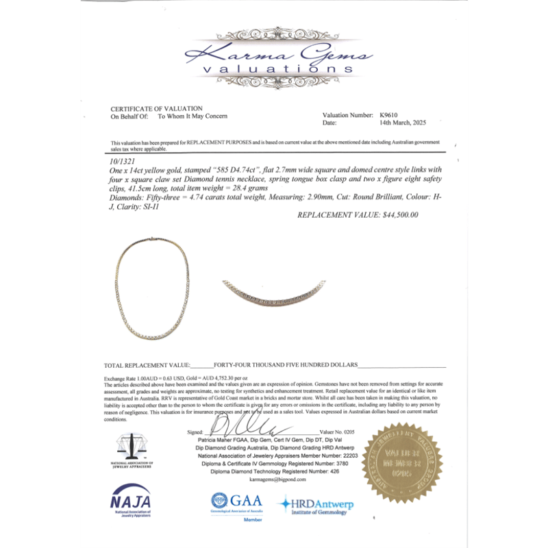 14K YELLOW GOLD, 4.74CT TDW DIAMOND NECKLACE. The Design Features, 53 Round Brilliant Cut, Diamonds (4.74Ct Tdw, H-J Colour, Si-I1 Clarity), Claw Set. The Necklace Has A Box Clasp With One Safety Latch. Chain Length Is 42Cm. 14K Yellow Gold, 4.74Ct Tdw Diamond Necklace. The Design Features, 53 Round Brilliant Cut, Diamonds (4.74Ct Tdw, H-J Colour, Si-I1 Clarity), Claw Set. The Necklace Has A Box Clasp With One Safety Latch. Chain Length Is 42Cm. Valuations Provided by an Independent Third-Party Professional Not Directly Associated With Lloyds Auctions at AUD $$44,500.00 This valuation has been conducted by an independent third-party professional. The valuation amount is an assessment by the issuing valuer and does not reflect the auction value of the item. Any inquiries regarding the valuation should be directed to the issuing valuer (refer to contact details on the certificate), as Lloyds Auctions has no affiliation or influence over the valuation, the valuer, or the stated amount. Condition: Good - Refer Images 0 645838+5389