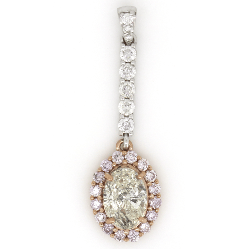 14K WHITE/ROSE GOLD AND DIAMOND, DROP PENDANT. The Pendant Features, One Oval Brilliant Cut, Diamond (1.20Ct Tdw, K-L Colour, Vs1-Vs2 Clarity), 4 Claw Set. Encompassing The Centre Diamond Are, 16 Round Brilliant Cut, Blush Pink, Diamonds (0.34Ct Tdw, Si1-Si2 Clarity), Claw Set. Decorating The Pendant Drop Are 8 Round Brilliant Cut, Diamonds (0.26Ct Tdw, G-H Colour, Si1-Si2 Clarity), Claw Set. Condition: New 14K White/Rose Gold And Diamond, Drop Pendant. The Pendant Features, One Oval Brilliant Cut, Diamond (1.20Ct Tdw, K-L Colour, Vs1-Vs2 Clarity), 4 Claw Set. Encompassing The Centre Diamond Are, 16 Round Brilliant Cut, Blush Pink, Diamonds (0.34Ct Tdw, Si1-Si2 Clarity), Claw Set. Decorating The Pendant Drop Are 8 Round Brilliant Cut, Diamonds (0.26Ct Tdw, G-H Colour, Si1-Si2 Clarity), Claw Set. Condition: New Valuations Provided by an Independent Third-Party Professional Not Directly Associated With Lloyds Auctions at AUD $$26,000.00This valuation has been conducted by an independent third-party professional. The valuation amount is an assessment by the issuing valuer and does not reflect the auction value of the item. Any inquiries regarding the valuation should be directed to the issuing valuer (refer to contact details on the certificate), as Lloyds Auctions has no affiliation or influence over the valuation, the valuer, or the stated amount. Condition: Good - Refer Images 0645838+5382