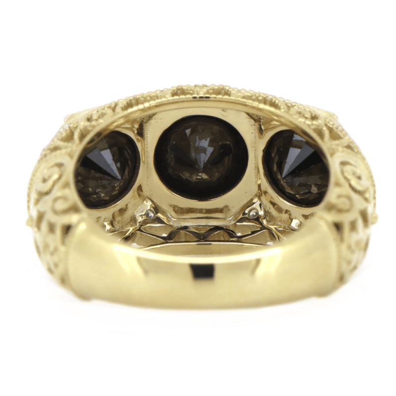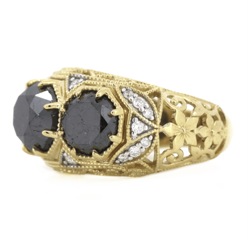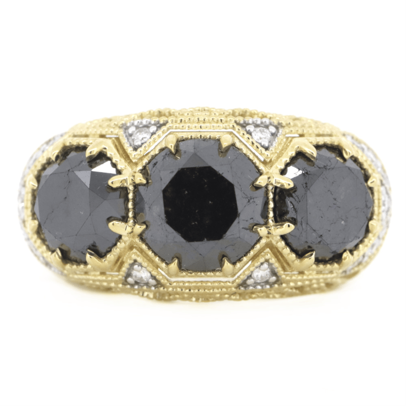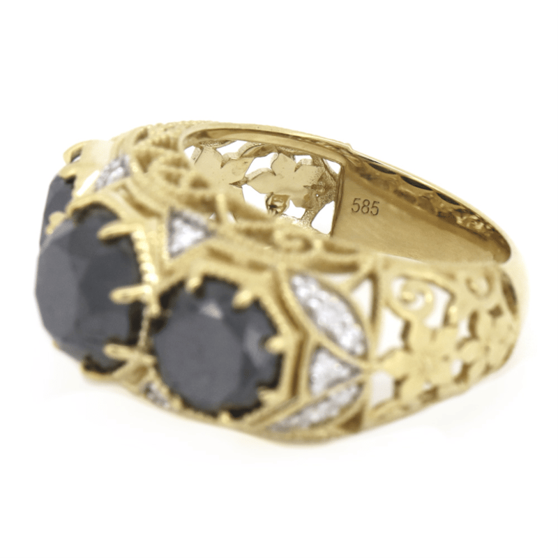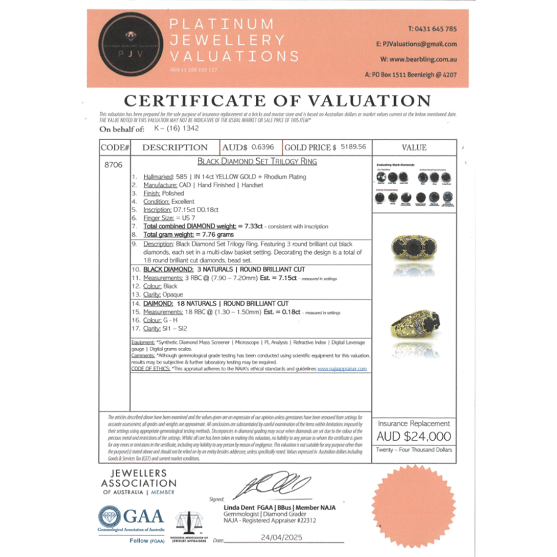 14K YELLOW GOLD, BLACK DIAMOND AND DIAMOND, TRILOGY RING. The Design Centrally Features, 3 Round Brilliant Cut, Black Diamonds (7.15Ct Tdw, Opaque Clarity), Multi-Claw Set. Decorating The Design Are, 18 Round Brilliant Cut, Diamonds (0.18Ct Tdw, G-H Colour, Si1-Si2 Clarity), Bead Set. Ring Size N 1/2. 14K Yellow Gold, Black Diamond And Diamond, Trilogy Ring. The Design Centrally Features, 3 Round Brilliant Cut, Black Diamonds (7.15Ct Tdw, Opaque Clarity), Multi-Claw Set. Decorating The Design Are, 18 Round Brilliant Cut, Diamonds (0.18Ct Tdw, G-H Colour, Si1-Si2 Clarity), Bead Set. Ring Size N 1/2. Valuations Provided by an Independent Third-Party Professional Not Directly Associated With Lloyds Auctions at AUD $$24,000.00This valuation has been conducted by an independent third-party professional. The valuation amount is an assessment by the issuing valuer and does not reflect the auction value of the item. Any inquiries regarding the valuation should be directed to the issuing valuer (refer to contact details on the certificate), as Lloyds Auctions has no affiliation or influence over the valuation, the valuer, or the stated amount. Condition: Good - Refer Images 0645838+5337