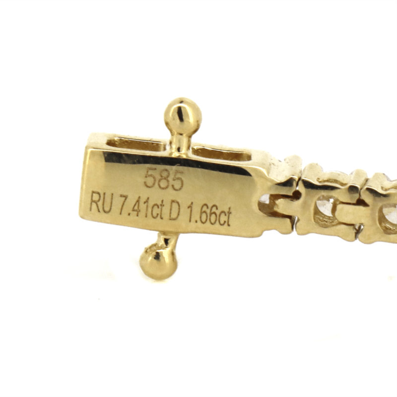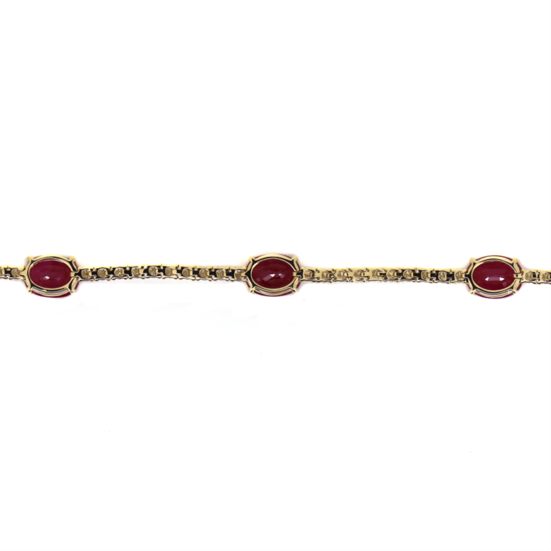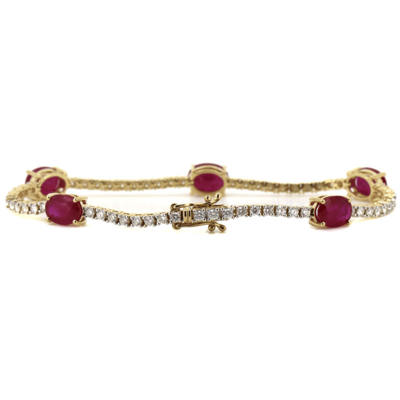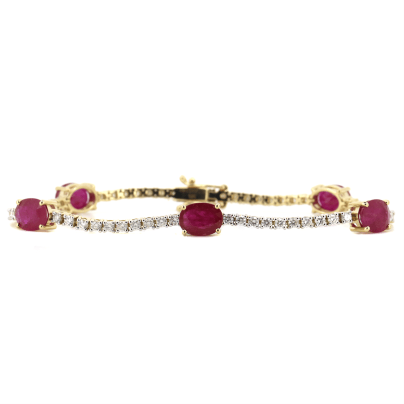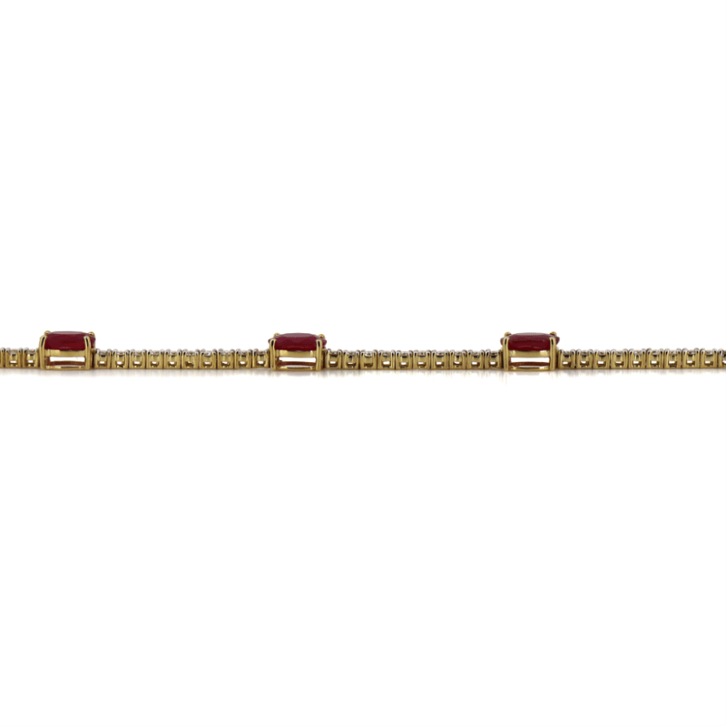 14K Yellow Gold, Ruby And Diamond, Line Bracelet. The Design Features, 5 Oval Mixed Cut, Deep Moderate Pinkish-Red, Rubies (7.41Ct Tsw, Slightly Included), Claw Set. Alternating Between Are, 57 Round Brilliant Cut, Diamonds (1.66Ct Tdw, G-H Colour, Si1-Si2 Clarity), Claw Set. The Bracelet Has A Hidden Box Lock Closure With 2 Safety Clips. Bracelet Length Is 18.5Cm. Condition: New.