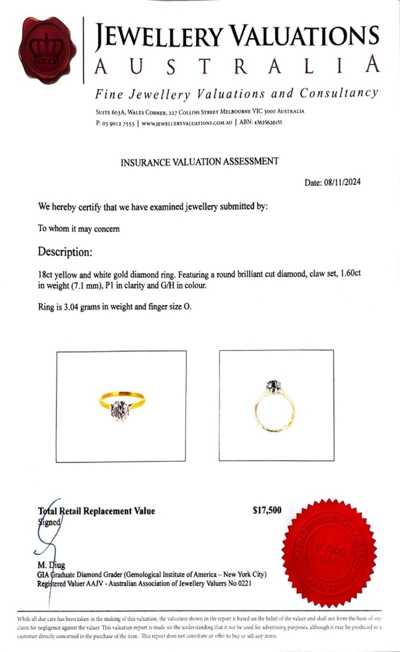 18CT YELLOW AND WHITE GOLD DIAMOND RING Total Item Weight: 3.04gms Featuring A Round Brilliant Cut Diamond, Claw Set, 1.60Ct In Weight (7.1 Mm), P1 In Clarity And G/H In Colour. Ring Is Finger Size O Jewellery Valuations Provided By A Third Party Professional Not Directly Associated With Lloyds Auctions at AUD $17500This Insurance Valuation has been provided by a registered Jewellery Valuer and is intended for insurance purposes only. The valuation amount has no bearing on the auction value of the item. Any questions regarding the valuation should be directed to the issuing Valuer (refer to contact details on the certificate) as Lloyds have no association or relationship with the Valuer or the valuation amount contained within the valuation. Condition: Excellent- Refer Images 0162826+6Crossdock