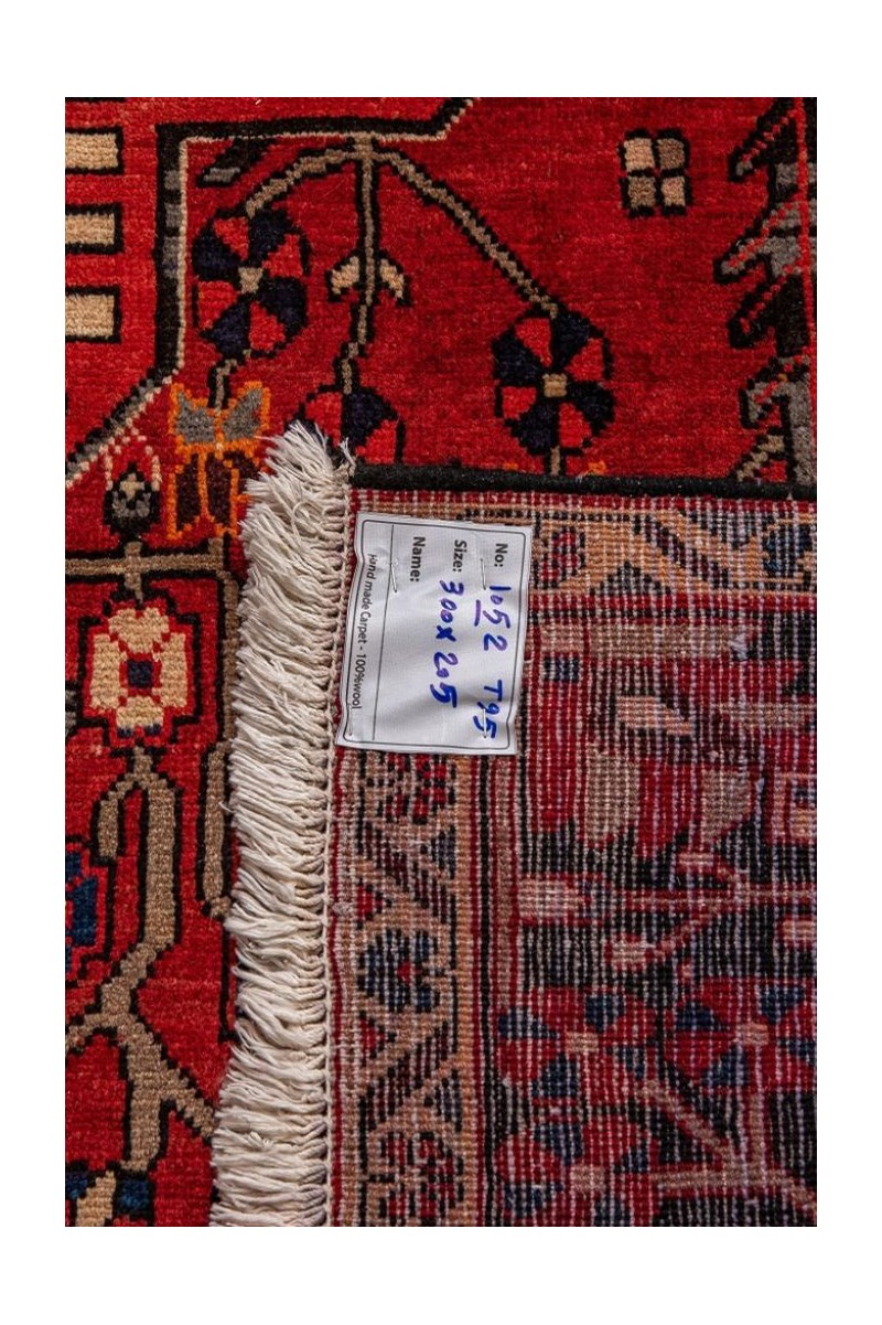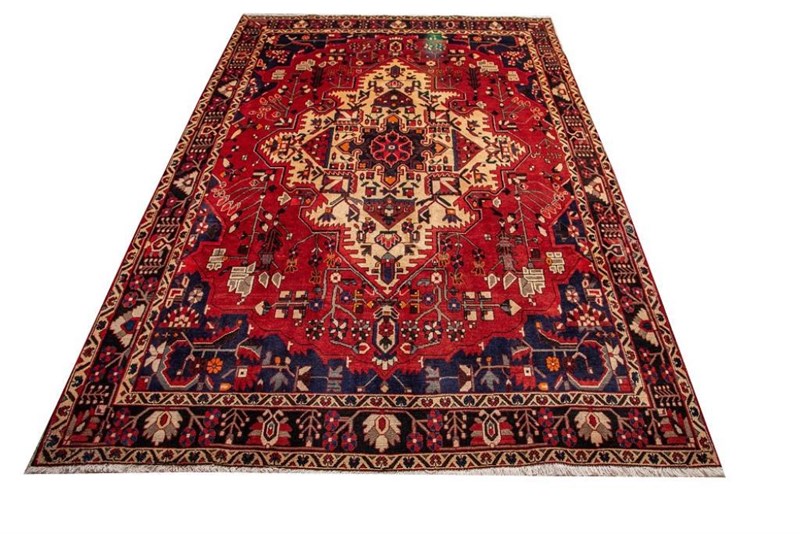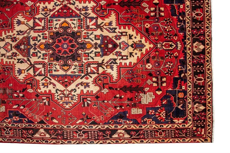 HAND KNOTTED PERISAN AZARBAYJAN HERIZ. 100% WOOL SOLID AND DENSE PILE. CREAM MEDALLION CENTER IN RED FILED WITH NAVY BORDER. SIZE(CM): 300 X 205. CIRCA 1980S. RRP: $5200 Condition: Good - Refer To Images +2
