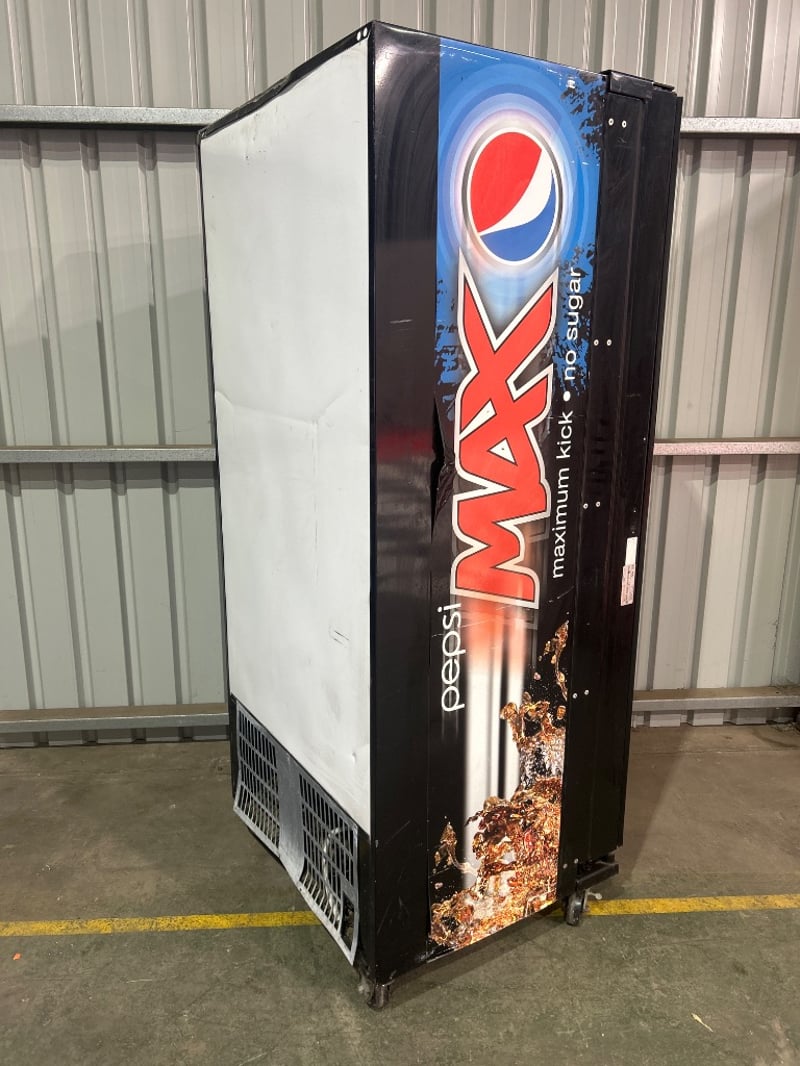 Vending Machine, Dixie Narco, Model: P1223 DN600E, Pepsi Max, Coin Operated, Refrigerated Beverage Machine, Includes Key. Dimensions: H:215cm x W:95cm x D:90cm Note: Non Operational / No Power.