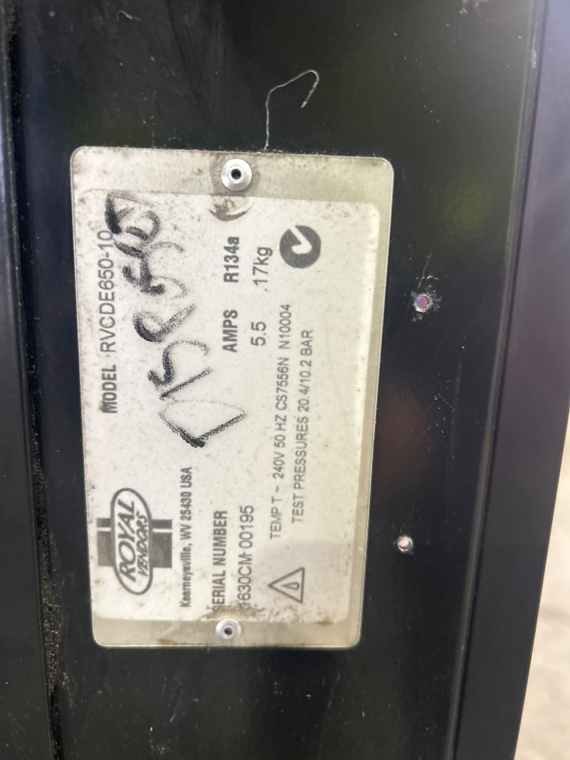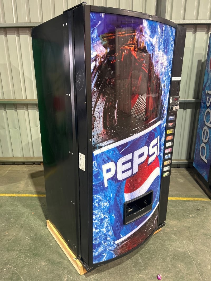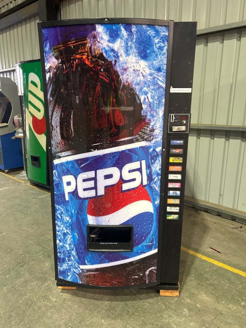 Vending Machine, Royal Vendors, Model: RVCDE650-10, Pepsi, Coin Operated, Refrigerated Beverage Machine, Includes Key. Dimensions: H:185cm x W:95cm x D:90cm Note: Not Operational / No Power.