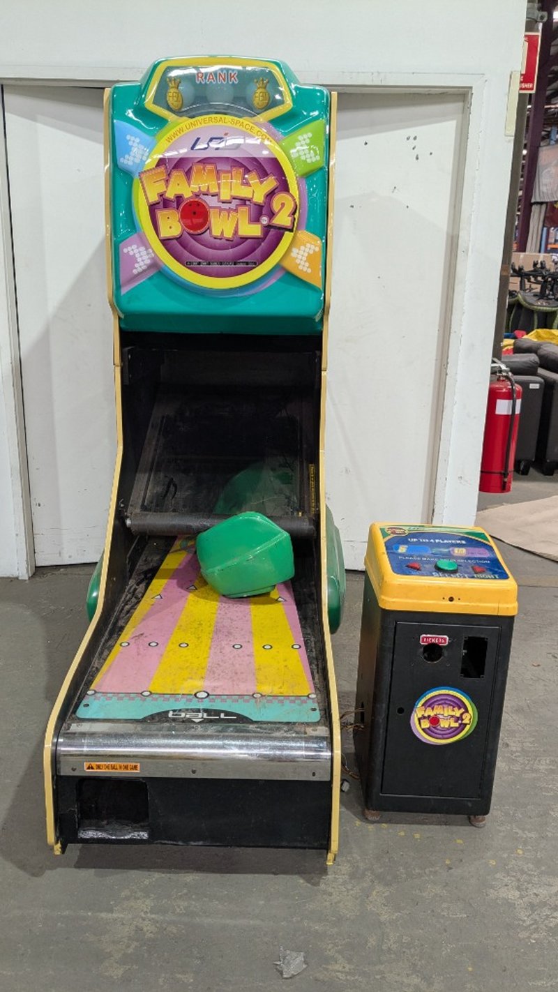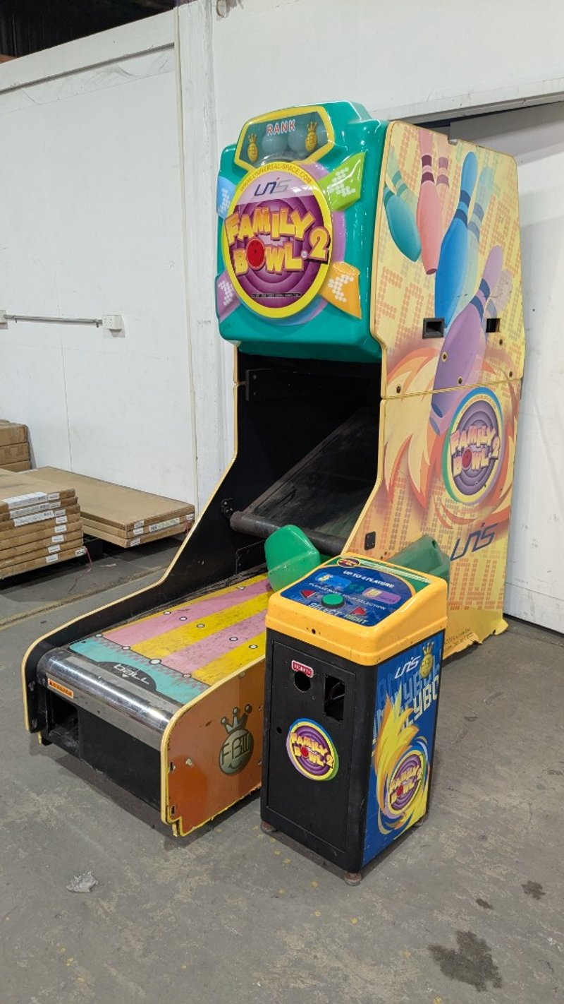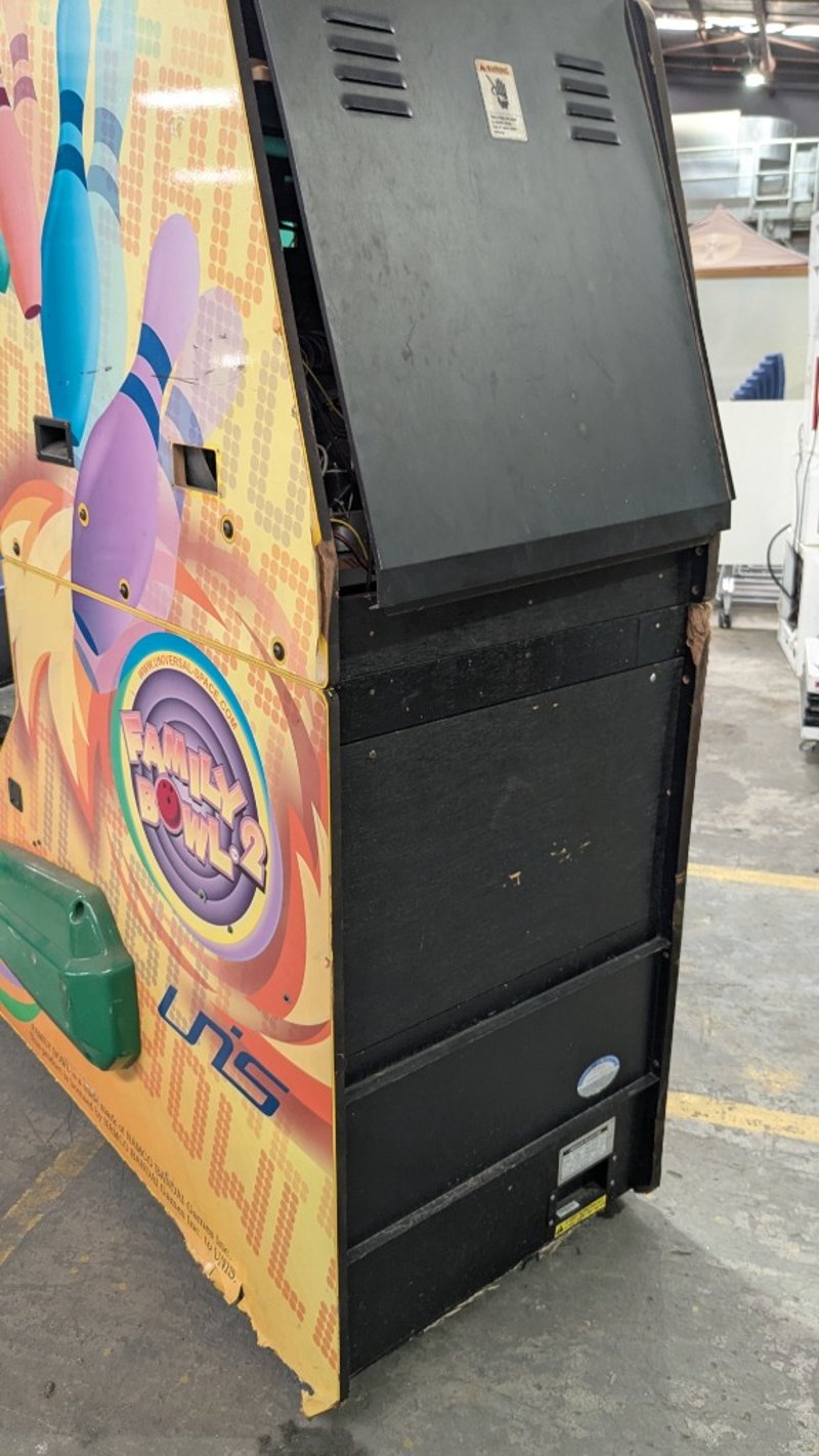Arcade Machine, Family Bowl 2 Dimensions: 200cm x 120cm x 190cm Note, untested, Suitable for parts, no power cords, damage to wheels