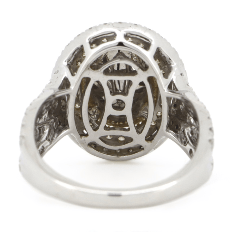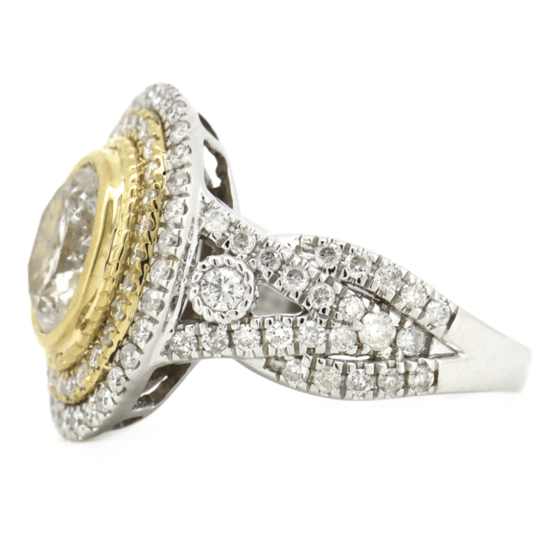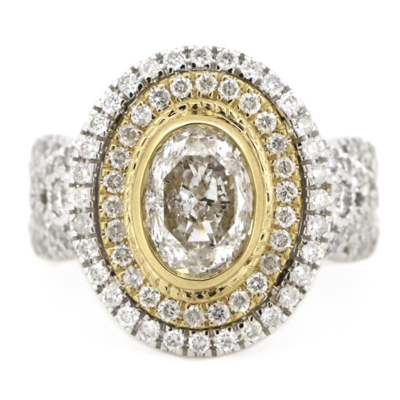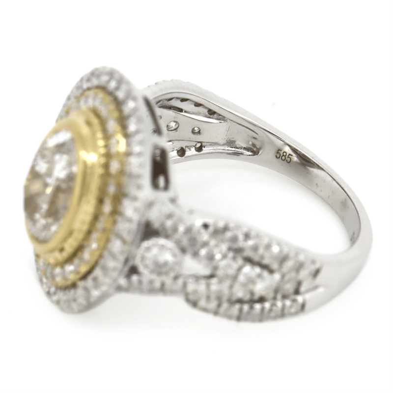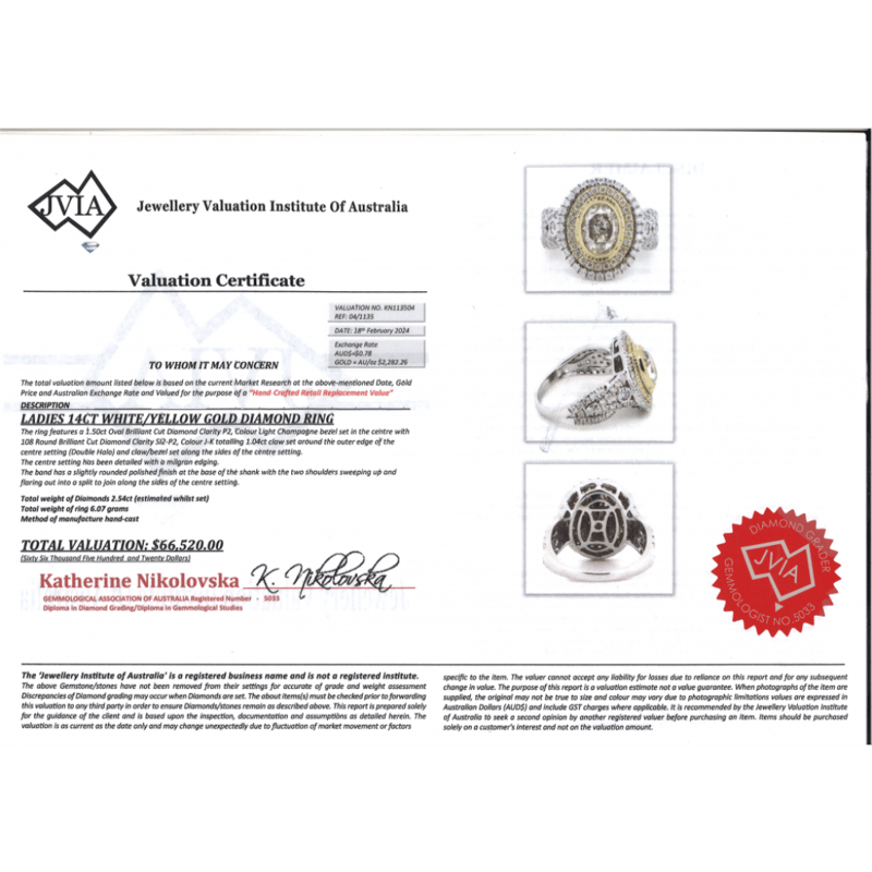 14K WHITE/YELLOW GOLD, CHAMPAGNE DIAMOND, DOUBLE HALO RING. The Centre Features, One Oval Brilliant Cut, Light Champagne, Diamond (1.50Ct, P2 Clarity), Bezel Set In Yellow Gold. Encompassing The Centre Are, 108 Round Brilliant Cut, Diamonds (1.04Ct Tdw, J-K Colour, Si2-P2 Clarity), Claw/Bezel Set In Yellow And White Gold. Ring Size M 1/2. 14K White/Yellow Gold, Champagne Diamond, Double Halo Ring. The Centre Features, One Oval Brilliant Cut, Light Champagne, Diamond (1.50Ct, P2 Clarity), Bezel Set In Yellow Gold. Encompassing The Centre Are, 108 Round Brilliant Cut, Diamonds (1.04Ct Tdw, J-K Colour, Si2-P2 Clarity), Claw/Bezel Set In Yellow And White Gold. Ring Size M 1/2. Valuations Provided by an Independent Third-Party Professional Not Directly Associated With Lloyds Auctions at AUD $$66,520.00This valuation has been conducted by an independent third-party professional. The valuation amount is an assessment by the issuing valuer and does not reflect the auction value of the item. Any inquiries regarding the valuation should be directed to the issuing valuer (refer to contact details on the certificate), as Lloyds Auctions has no affiliation or influence over the valuation, the valuer, or the stated amount. Condition: Good - Refer Images 0645838+5322