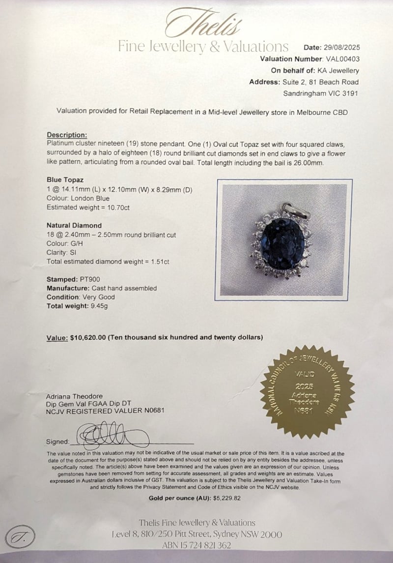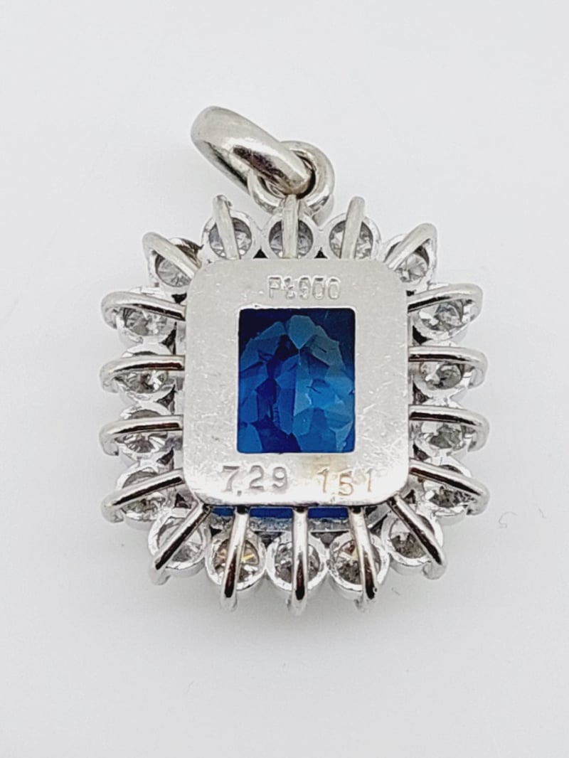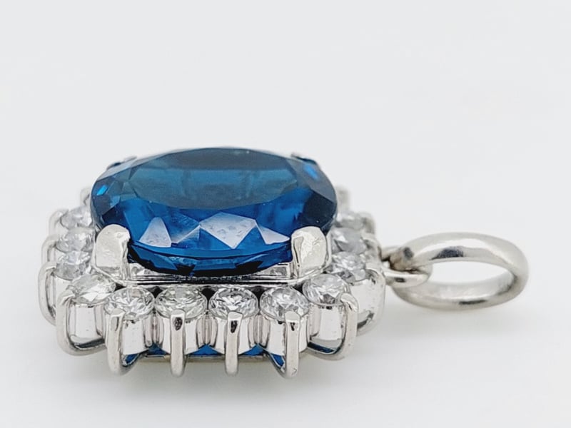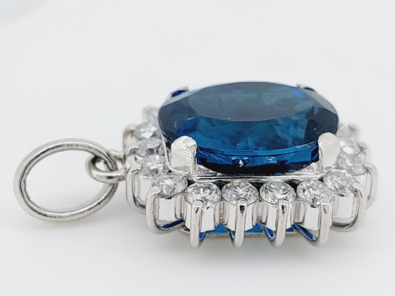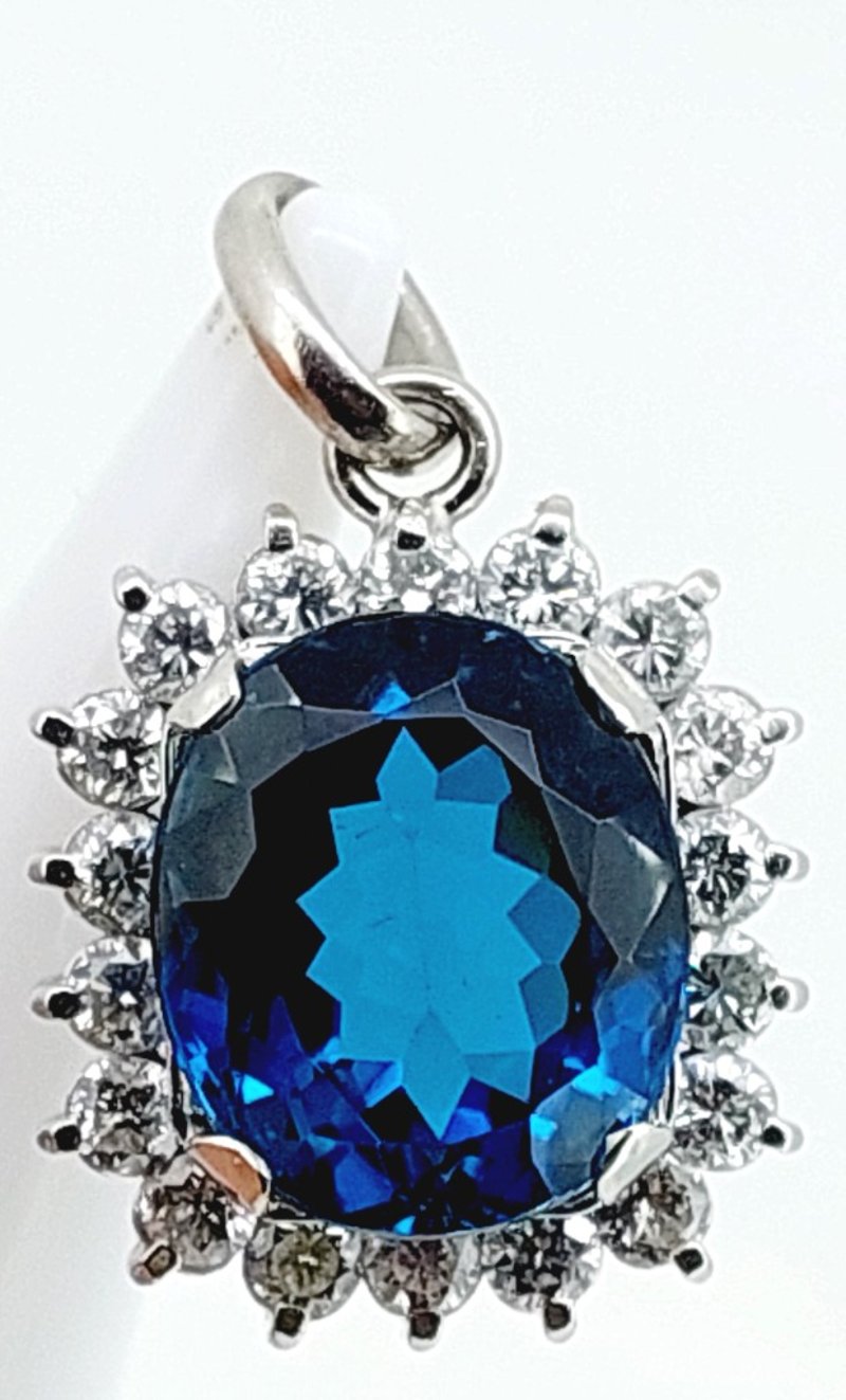 PLATINUM TOPAZ AND DIAMOND PENDANTThis Pendant Features One Oval Cut Topaz Set With Four Squared Claws, Surrounded By A Halo Of Eighteen Round Brilliant Cut Diamonds Set In End Claws To Give A Flower-Like Pattern, Articulating From A Rounded Oval Bail.Length: 26.00cmMarkings: Pt900Condition: Good - Refer To ImagesThis valuation has been conducted by an independent third-party professional. The valuation amount is an assessment by the issuing valuer and does not reflect the auction value of the item.Any inquiries regarding the valuation should be directed to the issuing valuer (refer to contact details on the certificate), as Lloyds Auctions has no affiliation or influence over the valuation, the valuer, or the stated amount.Insurance Replacement Valuation Amount: $10,620.00CROSSDOCK162949+23