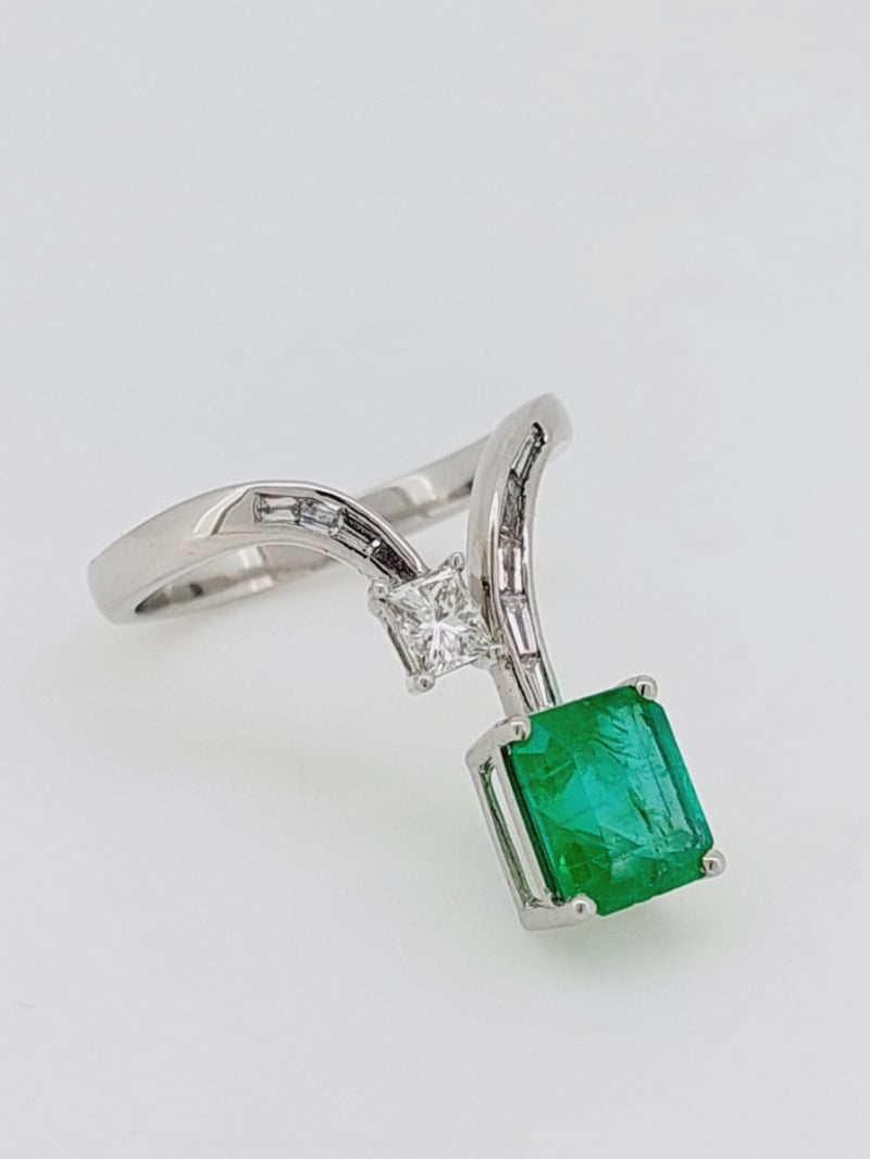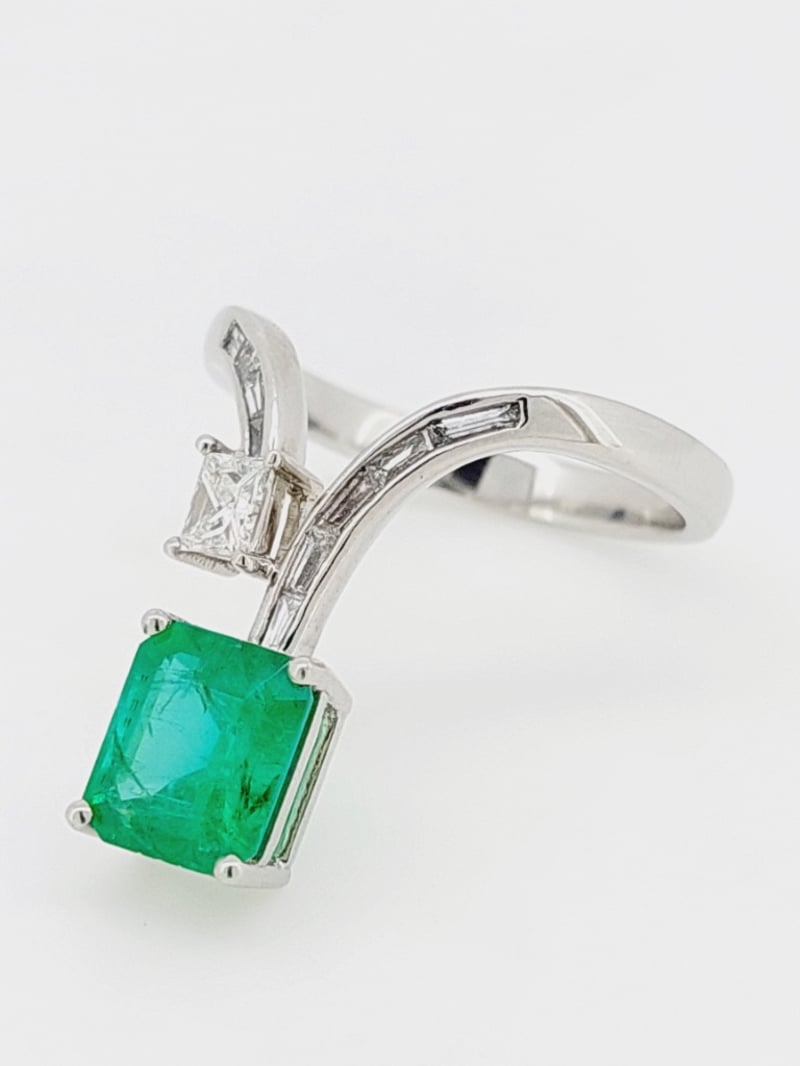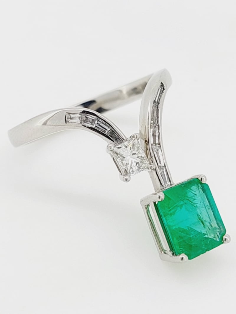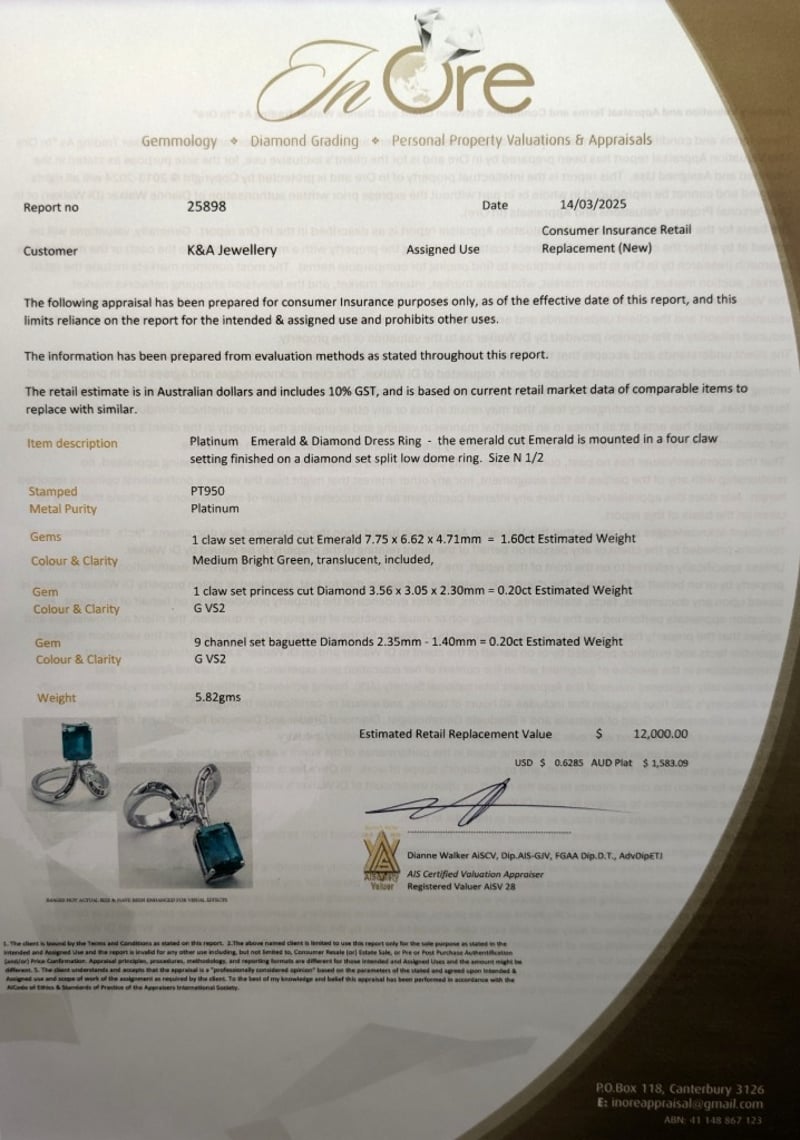 PLATINUM EMERALD AND DIAMOND DRESS RING The Emerald Cut Emerald Is Mounted In A Four Claw Setting Finished On A Diamond Set Split Low Dome Ring. Size N 1/2 Total Item Weight: 5.82g Markings: Pt950 Condition: Good - Refer To Images This valuation has been conducted by an independent third-party professional. The valuation amount is an assessment by the issuing valuer and does not reflect the auction value of the item. Any inquiries regarding the valuation should be directed to the issuing valuer (refer to contact details on the certificate), as Lloyds Auctions has no affiliation or influence over the valuation, the valuer, or the stated amount. Insurance Replacement Valuation Amount: $12,000.00 FC1 162949+4