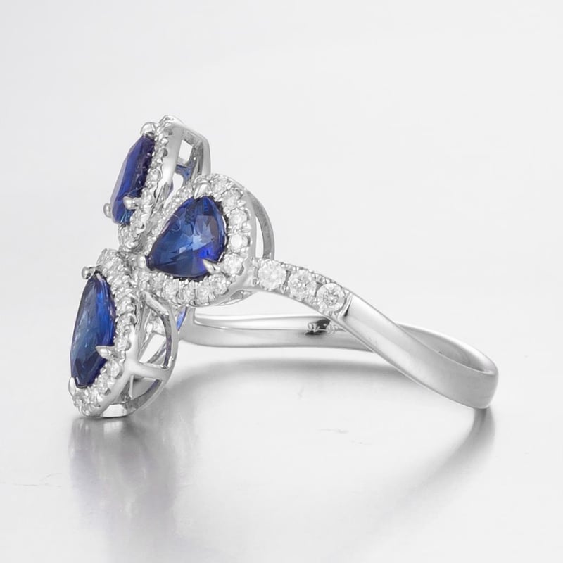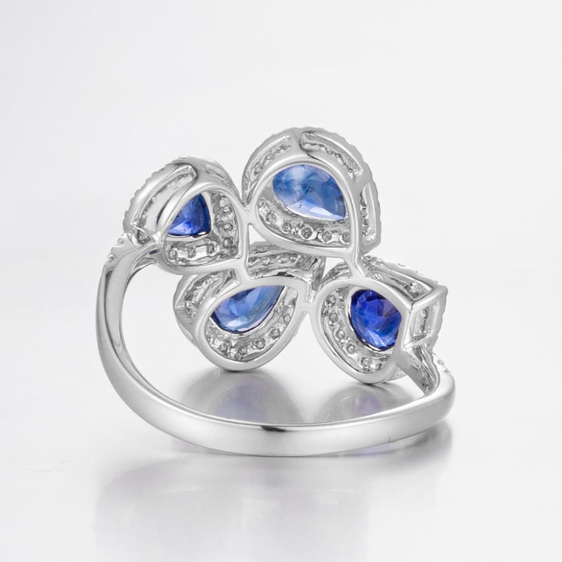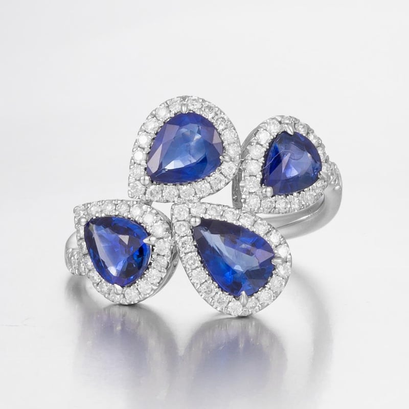 Featuring Centre, 4 Pear Cut, Medium Vivid Blue Ceylon Sapphires (2.51Ct Tsw, Moderate Inclusions), Claw Set, With 77 Round Brilliant Cut Diamonds (0.46Ct Tdw, G-H Colour, Si1-Si2 Clarity), Bead Set. Ring Size O.