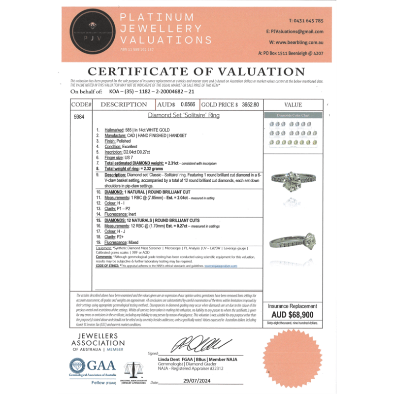 14K WHITE GOLD AND DIAMOND, CLASSIC RING. The Centre Features, One Round Brilliant Cut, Diamond (2.04Ct, H-I Colour, P1-P2 Clarity), 6 Claw Set. Decorating The Band Are, 12 Round Brilliant Cut, Diamonds (0.27Ct Tdw, H-J Colour, P2+ Clarity), Claw Set. Ring Size M 1/2. 14K White Gold And Diamond, Classic Ring. The Centre Features, One Round Brilliant Cut, Diamond (2.04Ct, H-I Colour, P1-P2 Clarity), 6 Claw Set. Decorating The Band Are, 12 Round Brilliant Cut, Diamonds (0.27Ct Tdw, H-J Colour, P2+ Clarity), Claw Set. Ring Size M 1/2. Valuations Provided by an Independent Third-Party Professional Not Directly Associated With Lloyds Auctions at AUD $$68,900.00This valuation has been conducted by an independent third-party professional. The valuation amount is an assessment by the issuing valuer and does not reflect the auction value of the item. Any inquiries regarding the valuation should be directed to the issuing valuer (refer to contact details on the certificate), as Lloyds Auctions has no affiliation or influence over the valuation, the valuer, or the stated amount. Condition: Good - Refer Images 0645838+5383