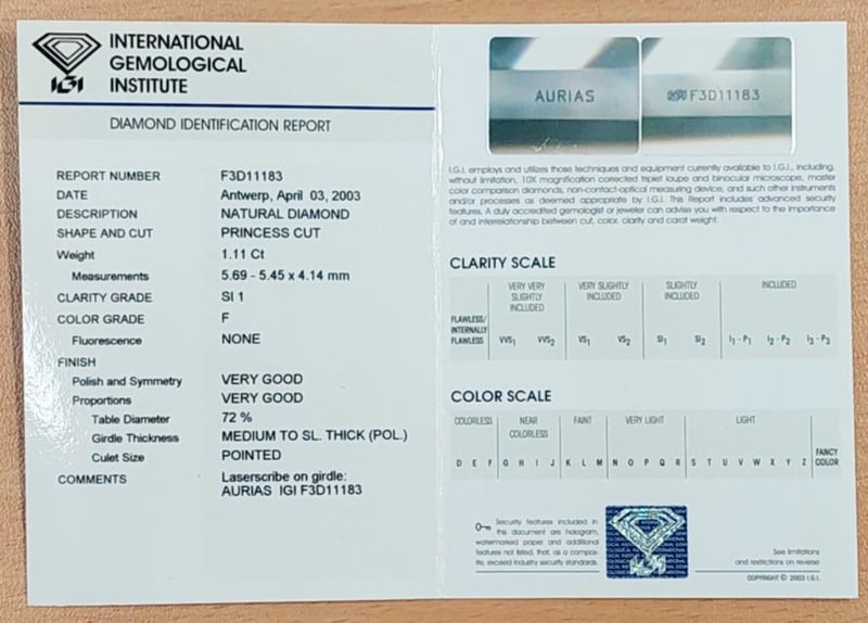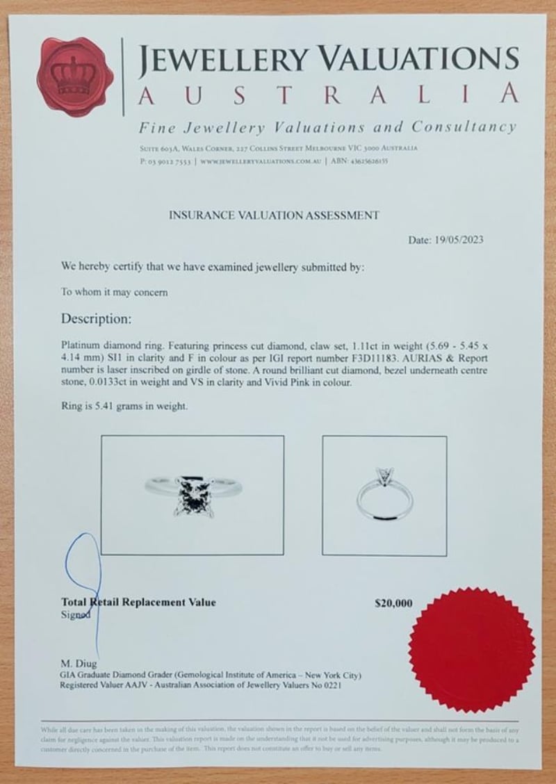 PLATINUM AND PRINCESS CUT DIAMOND RING Total Item Weight: 5.41gms This Platinum Ring Features 1 X 1.11Ct Princess Cut Claw Set Diamond Measuring 5.69Mm X 5.45Mm X 4.14Mm Is Si1 In Clarity And F In Colour As Per Igi Report Number F3D11183. Aurias & Report Number Is Laser Inscribed On The Girdle Of The Stone. This Platinum Ring Also Features 1 X 0.0133Ct Round Brilliant Cut Diamond Bezel Set Underneath The Main Stone, Vs In Clarity And Vivid Pink In Colour. Jewellery Valuations Provided By A Third Party Professional Not Directly Associated With Lloyds Auctions at AUD $20000This Insurance Valuation has been provided by a registered Jewellery Valuer and is intended for insurance purposes only. The valuation amount has no bearing on the auction value of the item. Any questions regarding the valuation should be directed to the issuing Valuer (refer to contact details on the certificate) as Lloyds have no association or relationship with the Valuer or the valuation amount contained within the valuation. Condition: Excellent- Refer Images 0162901+53CROSSDOCK