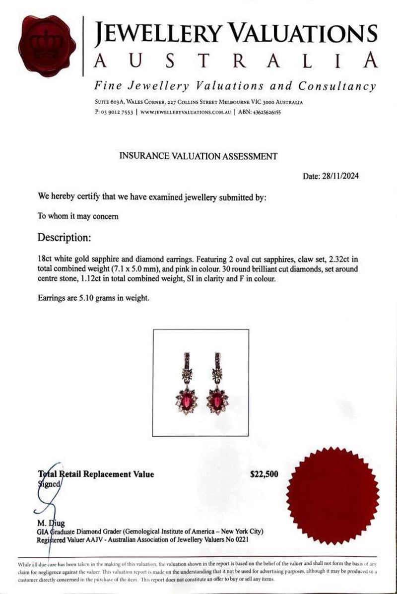 18CT WHITE GOLD SAPPHIRE AND DIAMOND EARRINGS Total Item Weight: 5.1gms These 18Ct White Gold Earrings Feature 2 X Oval Cut Claw Set Sapphires, 2.32Ct In Total Combined Weight, Measuring 7.1 X 5.0Mm And Pink In Colour With 30 X Round Brilliant Cut Diamonds, 1.12Ct In Total Combined Weight, Si In Clarity And F In Colour. Jewellery Valuations Provided By A Third Party Professional Not Directly Associated With Lloyds Auctions at AUD $22500 This Insurance Valuation has been provided by a registered Jewellery Valuer and is intended for insurance purposes only. The valuation amount has no bearing on the auction value of the item. Any questions regarding the valuation should be directed to the issuing Valuer (refer to contact details on the certificate) as Lloyds have no association or relationship with the Valuer or the valuation amount contained within the valuation. Condition: Excellent- Refer Images 0 162901+160 CROSSDOCK