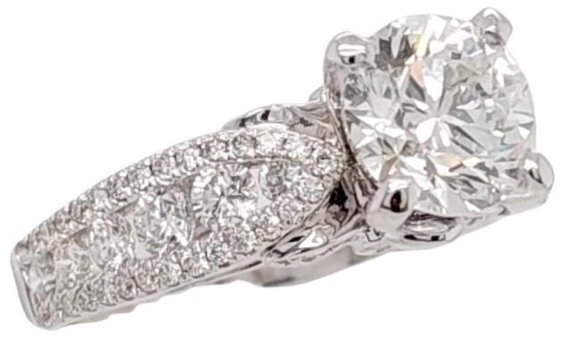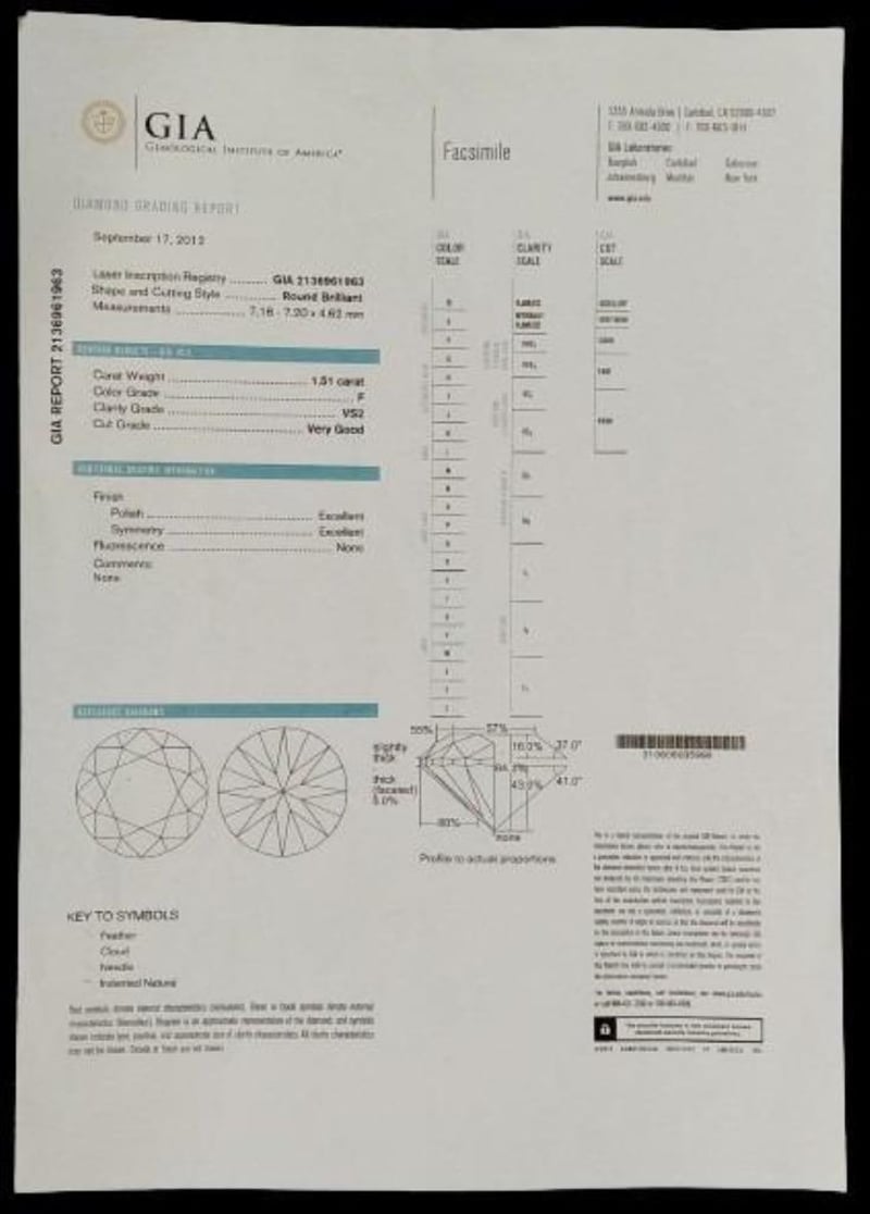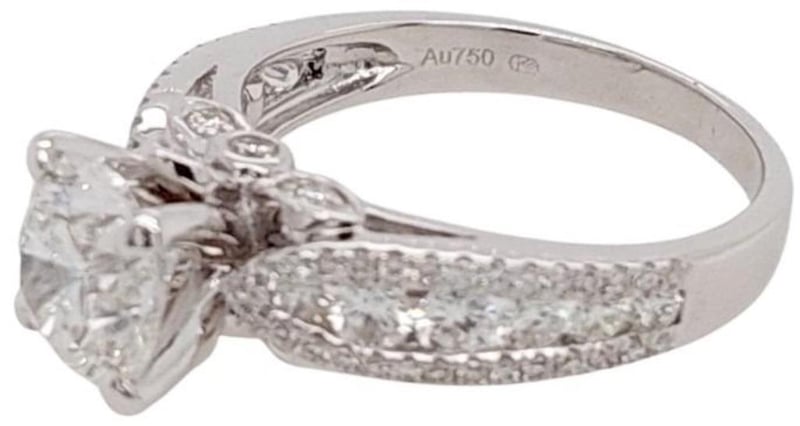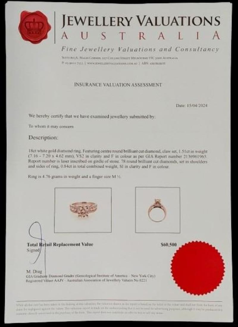 18CT WHITE GOLD AND DIAMOND RING Total Item Weight: 4.76gms This 18Ct White Gold Ring Features 1 X 1.51Ct Round Brilliant Cut Claw Set Diamond, Measuring 7.16-7.20Mm X 4.62Mm, Is Vs2 In Clarity And F In Colour As Per Gia Report Number 2136961963 Laser Inscribed On The Girdle Of The Stone. This Ring Also Features 78 X Round Brilliant Cut Diamonds Set In The Shoulders Of The Ring, 0.84Ct In Total Combined Weight, Si In Clarity And F In Colour.Ring Size: M 1/2 Markings: Au750 Jewellery Valuations Provided By A Third Party Professional Not Directly Associated With Lloyds Auctions at AUD $60500This Insurance Valuation has been provided by a registered Jewellery Valuer and is intended for insurance purposes only. The valuation amount has no bearing on the auction value of the item. Any questions regarding the valuation should be directed to the issuing Valuer (refer to contact details on the certificate) as Lloyds have no association or relationship with the Valuer or the valuation amount contained within the valuation. Condition: Excellent- Refer Images 0162901+103CROSSDOCK