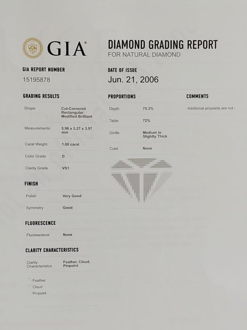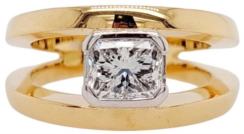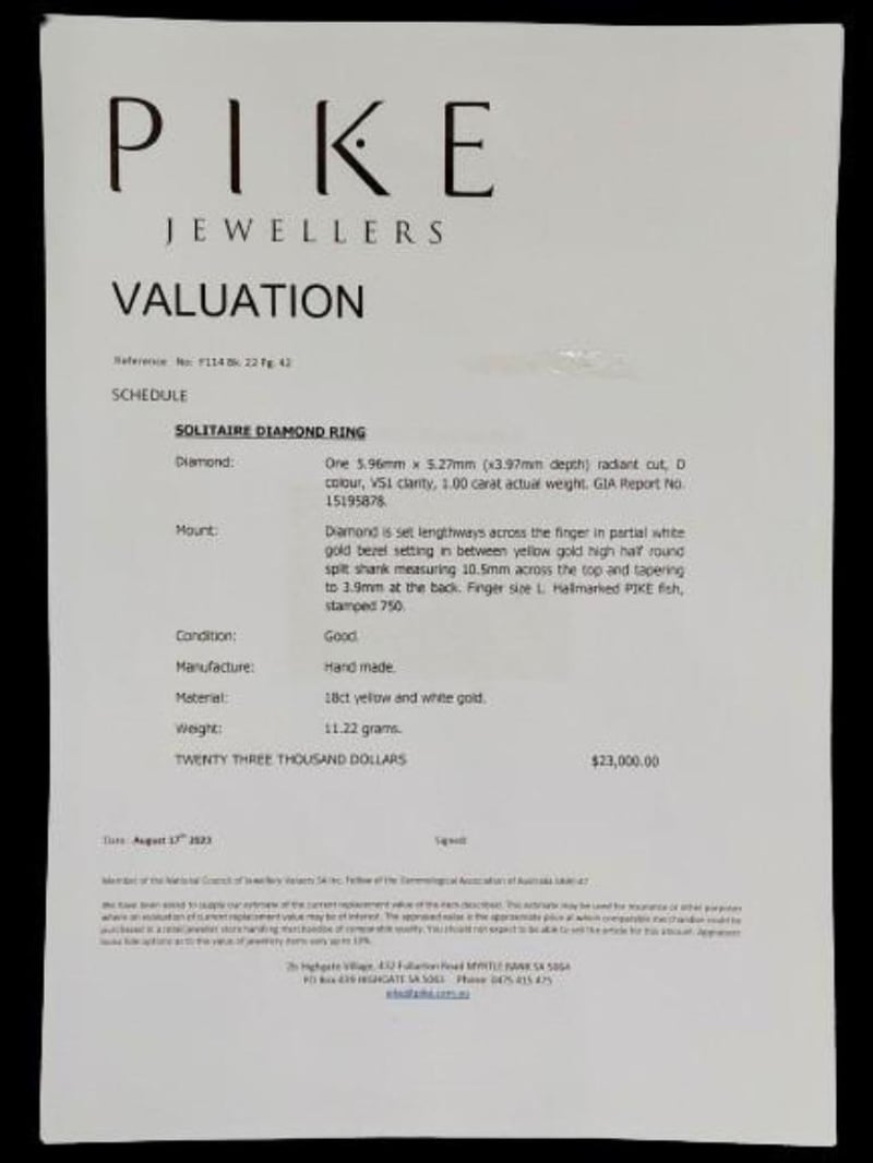18CT TWO TONE GOLD DIAMOND SOLITAIRE RING Total Item Weight: 11.22gms This 18Ct Gold Hand Made Ring Features 1 X 1.0Ct Radiant Cut Diamond, Measuring 5.96Mm X 5.27Mm X 3.97Mm, Is Vs1 In Clarity And D In Colour As Per Gia Report Number 15195878.Ring Size: L Markings: 750, Pike Fish Hallmark Jewellery Valuations Provided By A Third Party Professional Not Directly Associated With Lloyds Auctions at AUD $23000This Insurance Valuation has been provided by a registered Jewellery Valuer and is intended for insurance purposes only. The valuation amount has no bearing on the auction value of the item. Any questions regarding the valuation should be directed to the issuing Valuer (refer to contact details on the certificate) as Lloyds have no association or relationship with the Valuer or the valuation amount contained within the valuation. Condition: Excellent- Refer Images 0162901+104CROSSDOCK