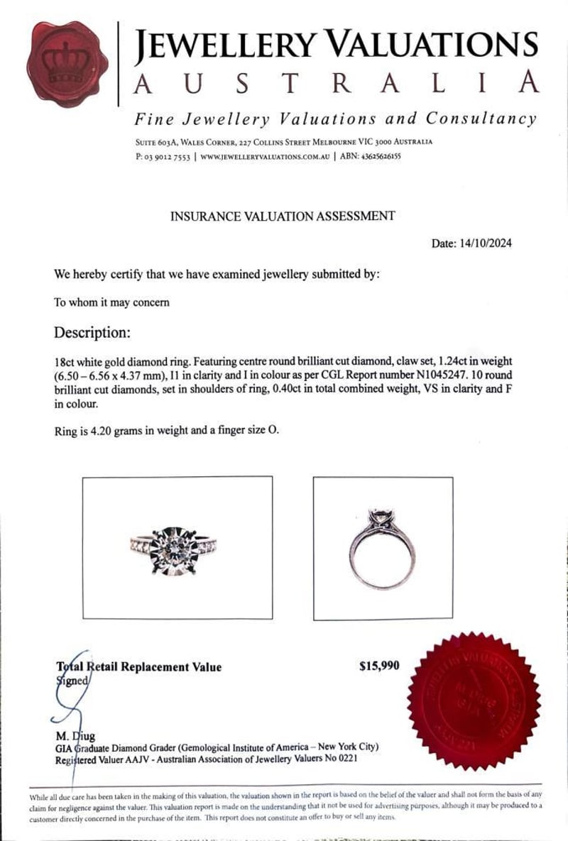 18K WHITE GOLD AND DIAMOND RING Total Item Weight: 4.2gms This 18Ct White Gold Ring Features 1 X 1.24Ct Brilliant Cut Claw Set Diamond Measuring 6.50 X 6.56 X 4.37Mm, Clarity: I1, Colour: I As Per Cgl Report Number N1045247. This Ring Also Features 10 X Round Brilliant Cut Diamonds Set In The Shoulders Of The Ring, Tcw: 0.40, Clarity: Vs, Colour: F. Ring Size: O Jewellery Valuations Provided By A Third Party Professional Not Directly Associated With Lloyds Auctions at AUD $15990 This Insurance Valuation has been provided by a registered Jewellery Valuer and is intended for insurance purposes only. The valuation amount has no bearing on the auction value of the item. Any questions regarding the valuation should be directed to the issuing Valuer (refer to contact details on the certificate) as Lloyds have no association or relationship with the Valuer or the valuation amount contained within the valuation. Condition: Excellent- Refer Images 0 162901+128 CROSSDOCK