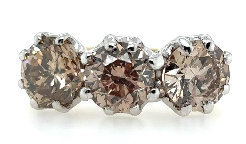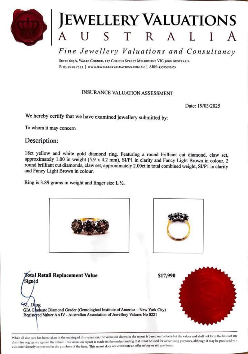 This 18Ct Yellow And White Gold Ring Features 1 X 1.0Ct Round Brilliant Cut Claw Set Diamond Measuring 5.9Mm X 4.2Mm, Is Si-P1 In Clarity And Fancy Light Brown In Colour With 2 X Round Brilliant Cut Claw Set Diamonds, 2.0Ct In Total Combined Weight, Si-P1 In Clarity And Fancy Light Brown In Colour. Ring Size: L.5