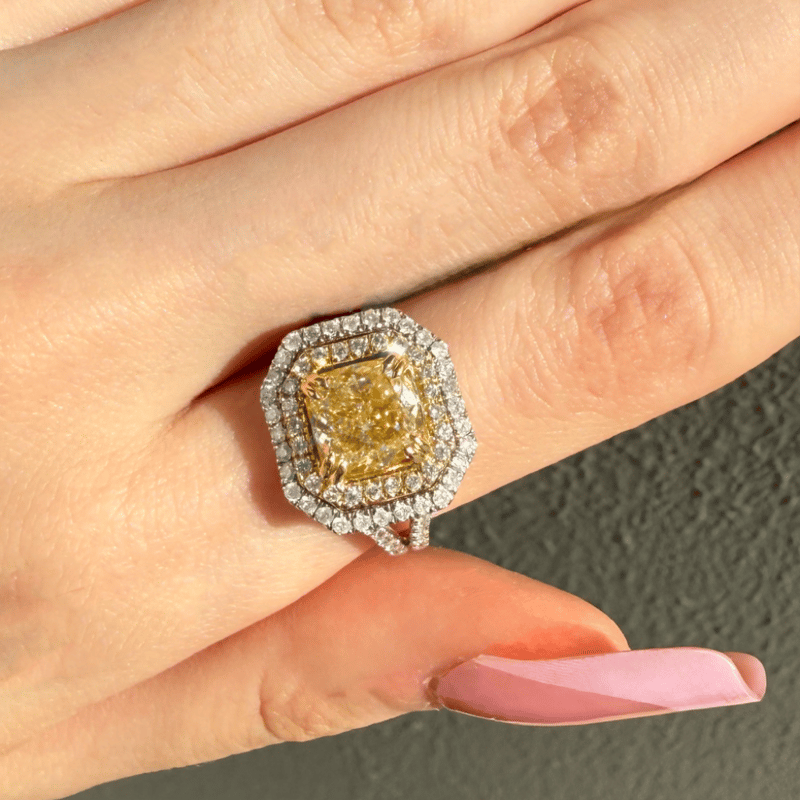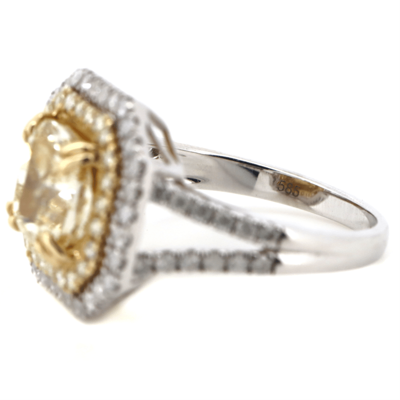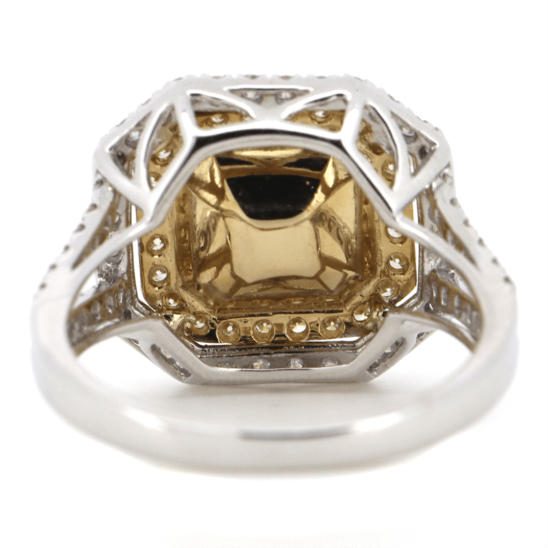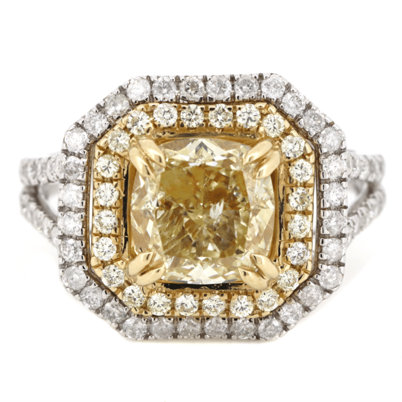 14K WHITE/YELLOW GOLD, FANCY YELLOW DIAMOND AND DIAMOND, DOUBLE HALO RING. The Centre Features, One Square Cushion Cut, Fancy Yellow Diamond, (2.80Ct, Si2 Clarity), Double 4 Claw Set. Surrounding The Centre In A Halo Are, 24 Round Brilliant Cut, Fancy Yellow, Diamonds, (0.30Ct Tdw, Si2-P1 Clarity), Claw Set. Surrounding The Outer Edge Of The Inner Halo And Decorating The Band Are, 57 Round Brilliant Cut, Diamonds, (0.49Ct Tdw, I-K Colour, Si2-P2 Clarity), Claw Set. Ring Size M 1/2. Valuations Provided by an Independent Third-Party Professional Not Directly Associated With Lloyds Auctions at AUD $$79,750.00This valuation has been conducted by an independent third-party professional. The valuation amount is an assessment by the issuing valuer and does not reflect the auction value of the item. Any inquiries regarding the valuation should be directed to the issuing valuer (refer to contact details on the certificate), as Lloyds Auctions has no affiliation or influence over the valuation, the valuer, or the stated amount. Condition: Good - Refer Images 0645844+5028
