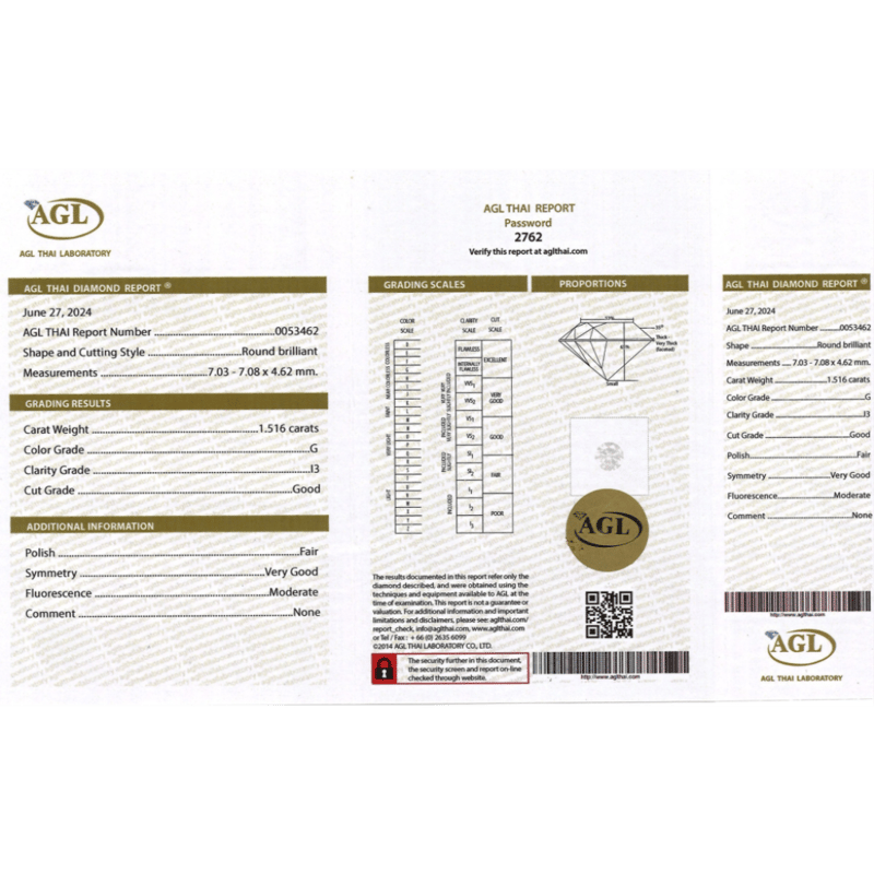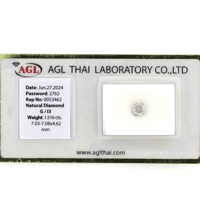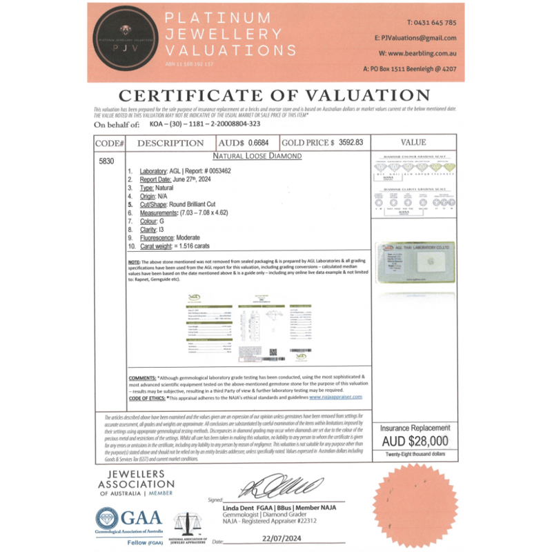 1.516CT CERTIFIED, NATURAL DIAMOND, ROUND BRILLIANT CUT, G COLOUR, I3 CLARITY, LOOSE, UNSET. Stone Comes Sealed With Agl Report: 0053462. Valuations Provided by an Independent Third-Party Professional Not Directly Associated With Lloyds Auctions at AUD $$28,000.00This valuation has been conducted by an independent third-party professional. The valuation amount is an assessment by the issuing valuer and does not reflect the auction value of the item. Any inquiries regarding the valuation should be directed to the issuing valuer (refer to contact details on the certificate), as Lloyds Auctions has no affiliation or influence over the valuation, the valuer, or the stated amount. Condition: Good - Refer Images 0645844+5097