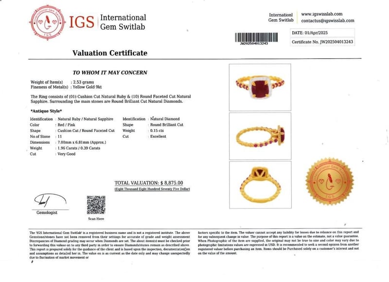 9CT YELLOW GOLD PINK SAPPHIRE AND DIAMOND RING Ring Yellow Gold 9K Natural Pink Sapphire : 0.39 Carat Natural Ruby : 1.96 Carat Natural Diamond : 0.15 Carat Item Weight : 2.53 G Valuations Provided by an Independent Third-Party Professional Not Directly Associated With Lloyds Auctions at AUD $8875This valuation has been conducted by an independent third-party professional. The valuation amount is an assessment by the issuing valuer and does not reflect the auction value of the item. Any inquiries regarding the valuation should be directed to the issuing valuer (refer to contact details on the certificate), as Lloyds Auctions has no affiliation or influence over the valuation, the valuer, or the stated amount. Condition: Good - Refer Images 0586170+13243