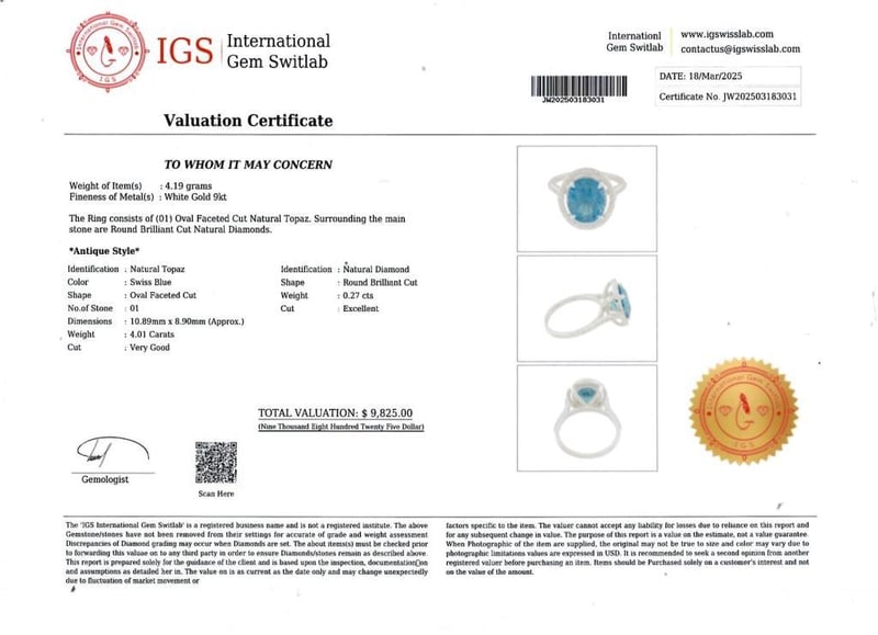 9CT WHITE GOLD BLUE TOPAZ AND DIAMOND RING Date : 10 -03-2025 Category : Ring Comment : White Gold 9K Natural Swiss Blue Topaz : 4.01 Carat Natural Diamond : 0.27 Carat Item Weight : 4.19 G Condition: Good - Refer Images 183031488285+183031