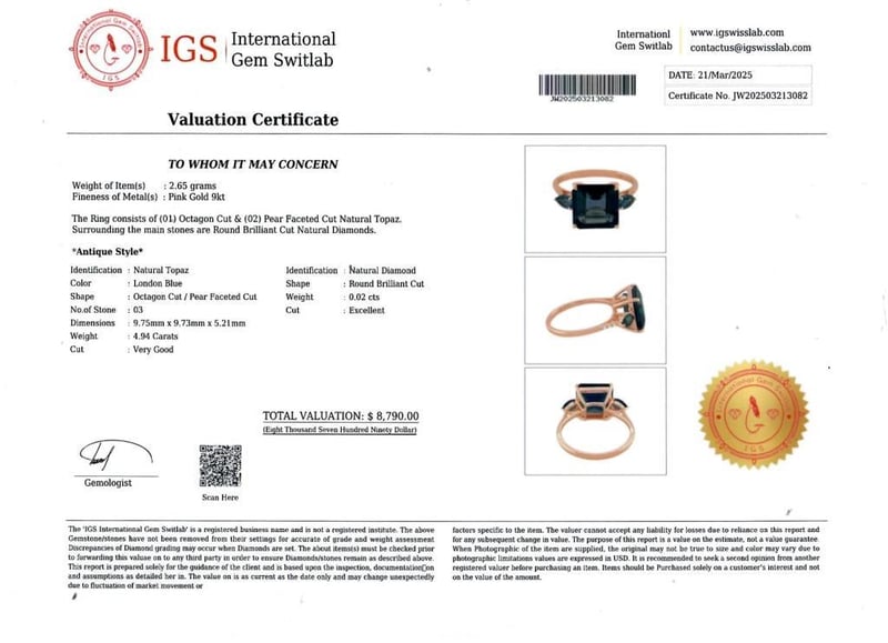 9CT PINK GOLD TOPAZ DIAMOND RING Date : 21 -03-2025 Category: Ring Comment: Pink Gold 9K Natural London Blue Topaz : 4.94 Carat Natural Diamond : 0.02 Carat Item Weight : 2.65 G Condition: Good - Refer Images 213082488285+213082