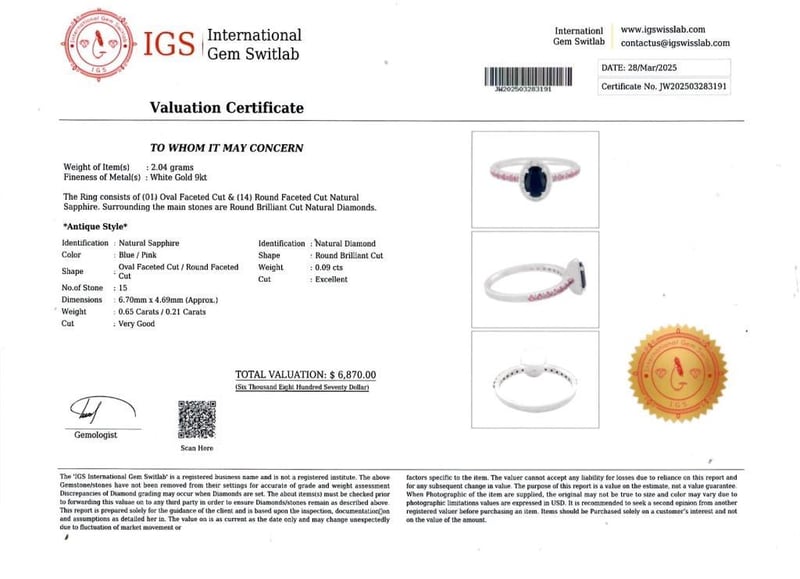 9CT WHITE GOLD SAPPHIRE AND DIAMOND RING Date : 27 -03-2025 Category: Ring Comment: White Gold 9K Natural Blue Sapphire : 0.65 Carat Natural Pink Sapphire : 0.21 Carat Natural Diamond : 0.09 Carat Item Weight : 2.04 G Condition: Good - Refer Images 283191488285+283191
