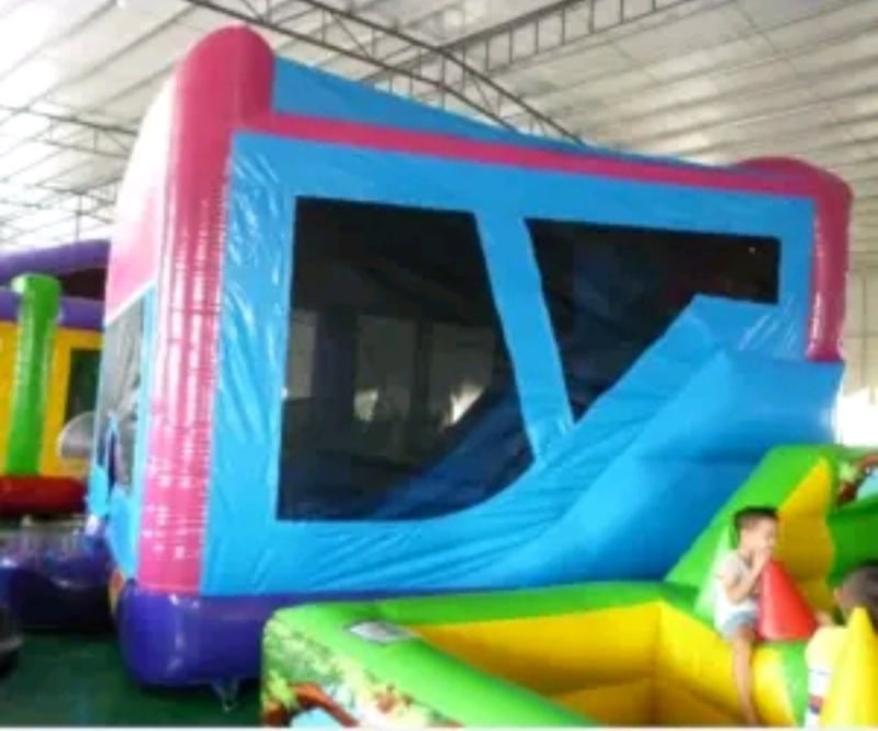 Jumping Castle, Pink/Purple C4 Combo Features a large bounce area, basketball hoop, climbing wall, slide. Well-loved castle has made many kids birthdays one to remember, (blower included), Size: 5.8 Length x 4.5m Width x 4m Height, Slide platform height 2.2m