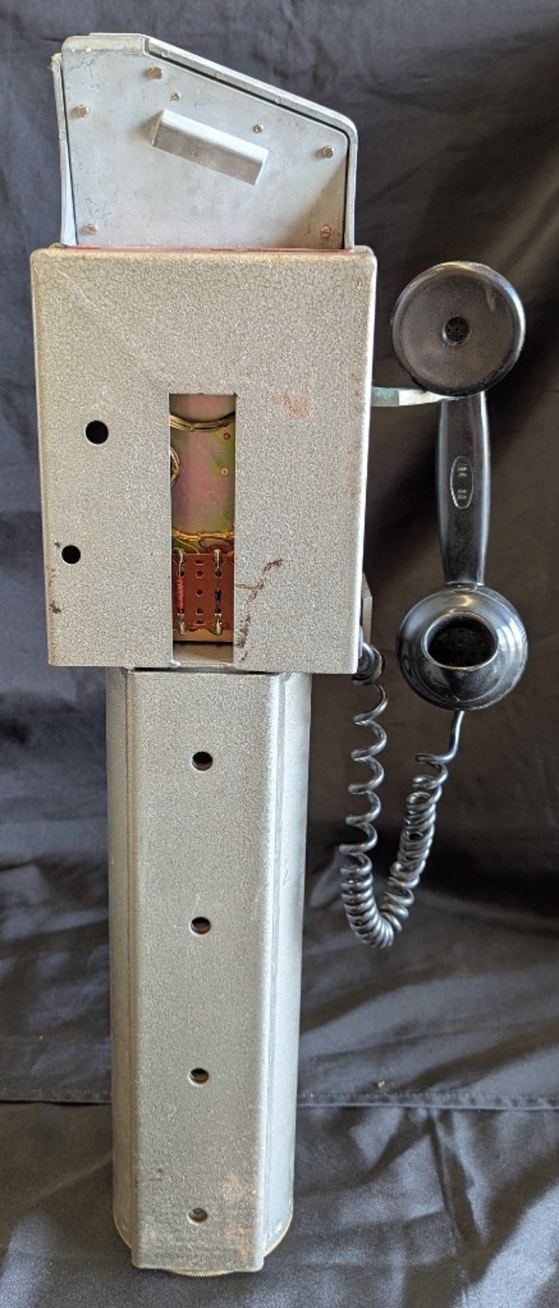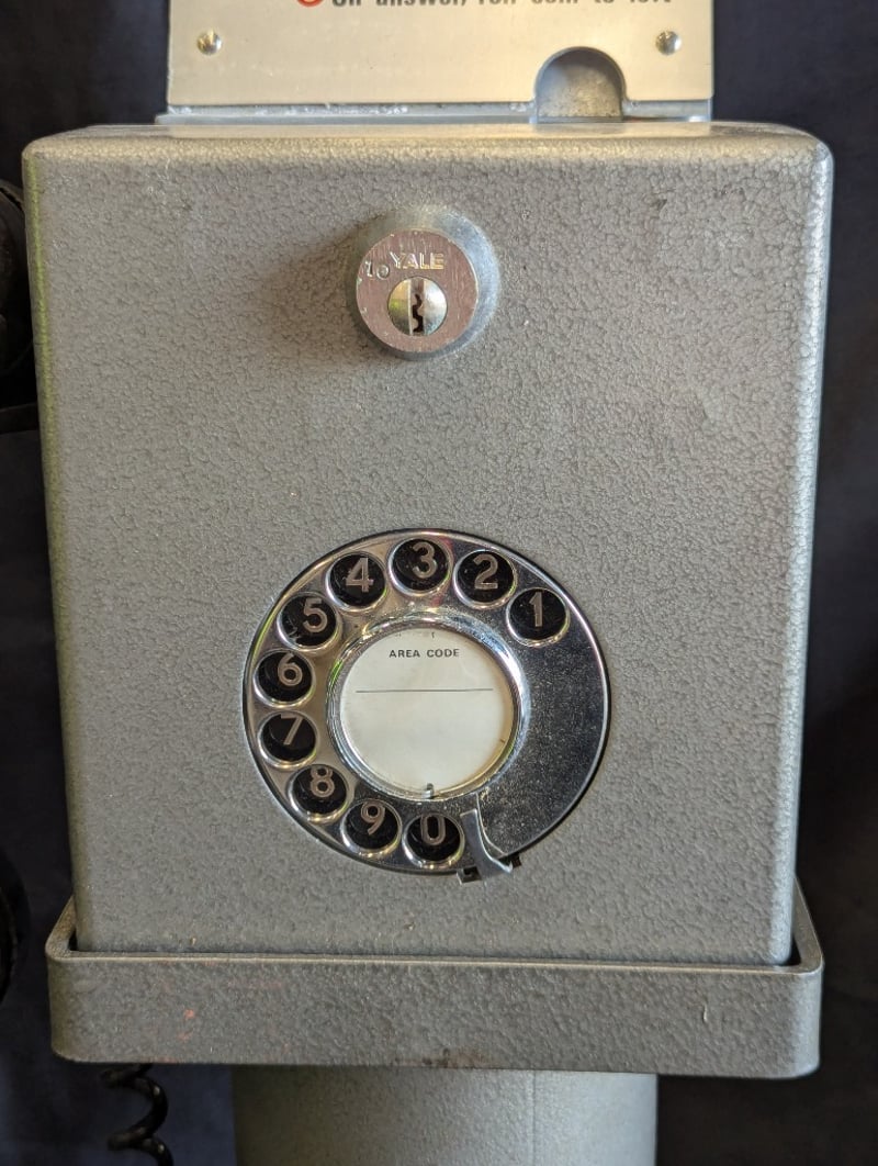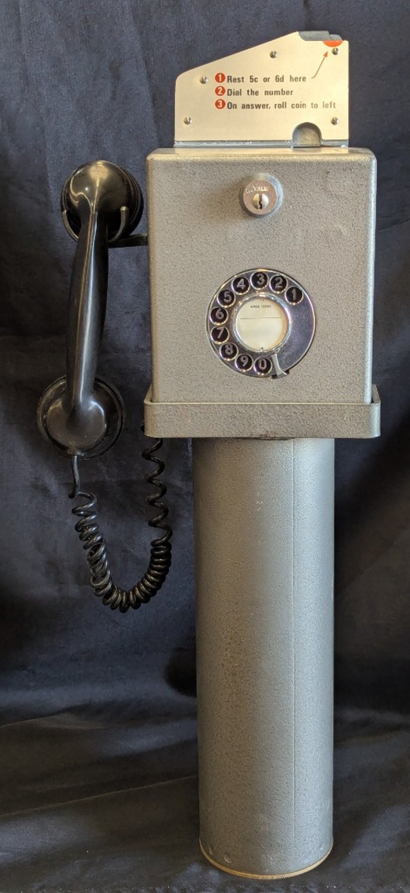 PILLAR STYLE PAYPHONE Metal Construction, Rotary Dial, Wired Handset, Handset Mount On Side, Includes Set Of Three Keys Item Size: 67cm H x 22cm W x 14cm D Condition: Very Good