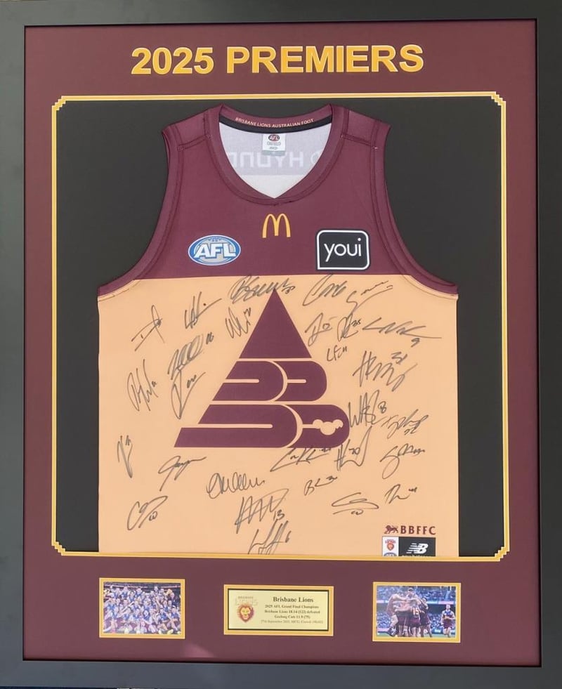 2025 BRISBANE LIONS PERSONALLY SIGNED HERTITAGE GUERNSEY (2025 AFL GRAND FINAL CHAMPIONS) Framed Using Double Mats, 2 Unsigned Photographs And A Plaque. Hand Signed By 28 Members Of The 2025 Brisbane Lions Squad Using A Black MarkerAccompanied By A Certificate Of AuthenticitySize: 109 X 2 X 89 Condition: Good - Refer To Images488295+2