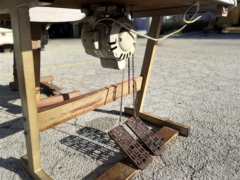 Includes mounted table, dual treadle foot pedals, and electric motor underneath.