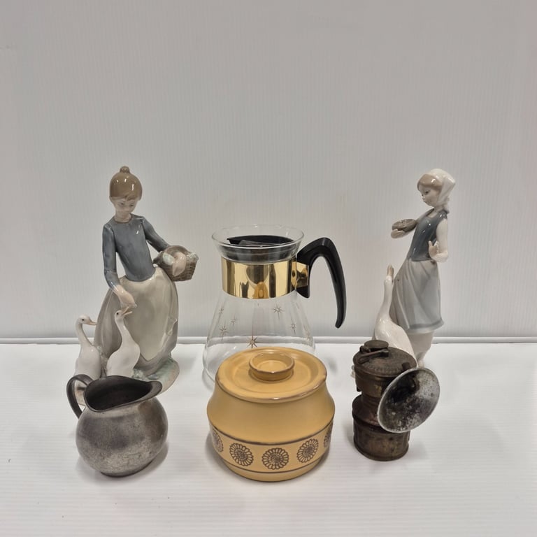 2 VINTAGE PORCELAIN FIGURINES, COFFEE JUG AND MORE