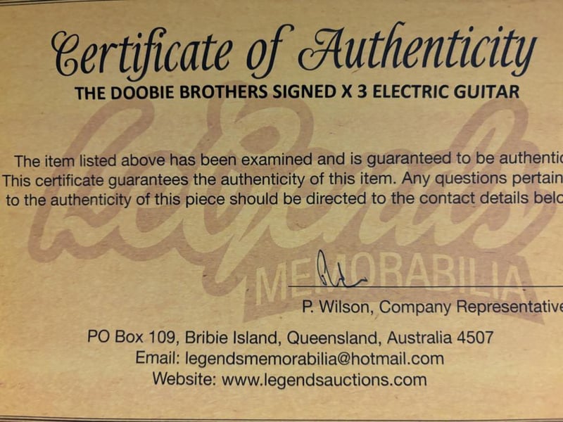 The Doobie Brothers Signed Full Size Electric Guitar. The Guitar Is Signed By Patrick Simmons, John Mcfee And Tom Johnson. The Group'S Fourteen Studio Albums Include Six Top-Ten Appearances On The Billboard 200 Album Chart, Including 1978'S Minute By Minute, Which Reached Number One For Five Weeks, And Won A Grammy For Best Pop Vocal Performance By A Duo Or Group, And "What A Fool Believes" Won Three Grammys Itself. The Item Is Accompanied By A Certificate Of Authenticity.