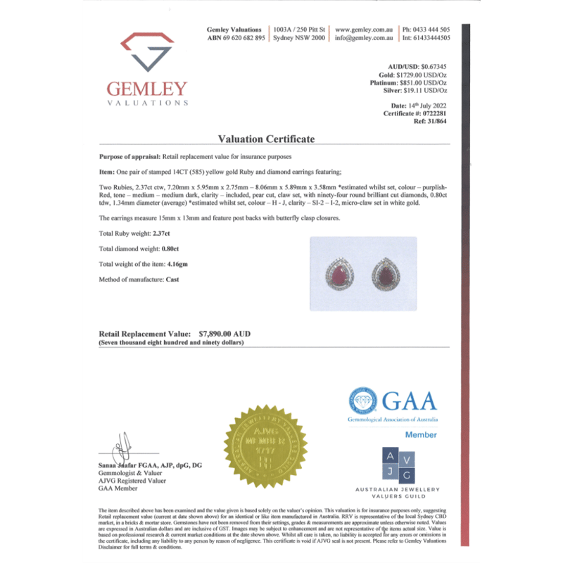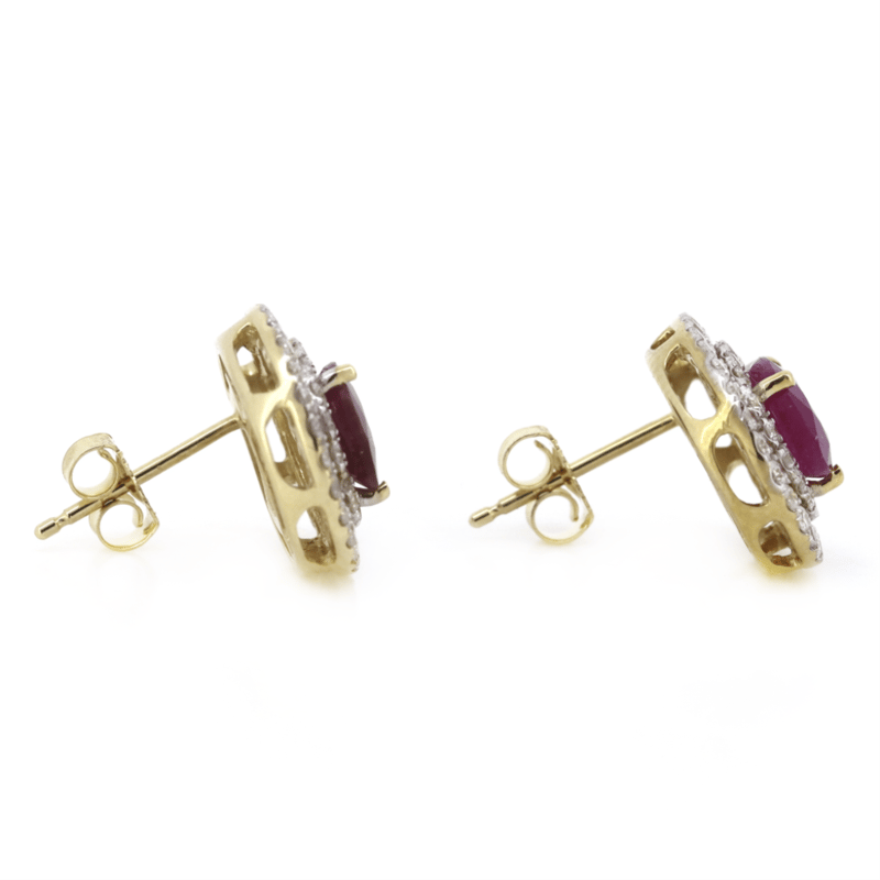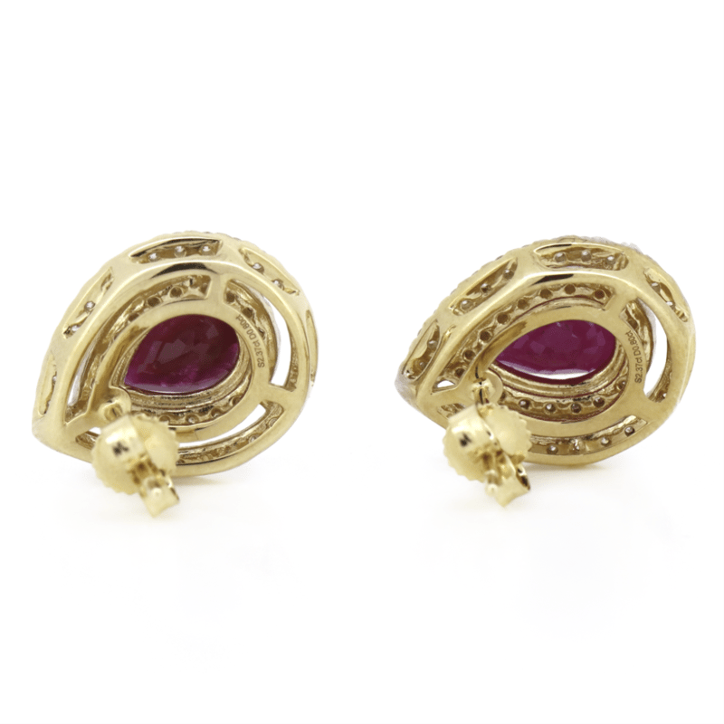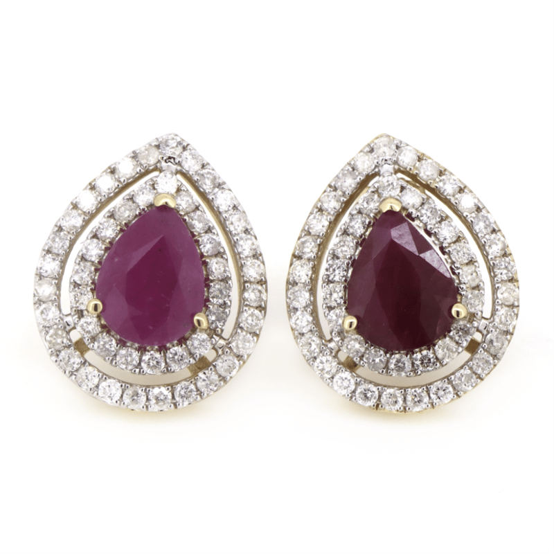 The Centres Feature, 2 Pear Cut, Medium Dark Pinkish-Red, Rubies (2.37Ct Tsw, Included), 3 Claw Set. Surrounding The Centres In Double Halos Are, 94 Round Brilliant Cut, Diamonds (0.80Ct Tdw, H-J Colour, Si2-I2 Clarity), Micro Claw Set. The Earrings Have Post Backs, With 14K Yellow Gold Butterfly Clasps.