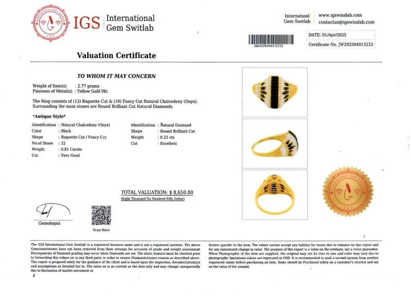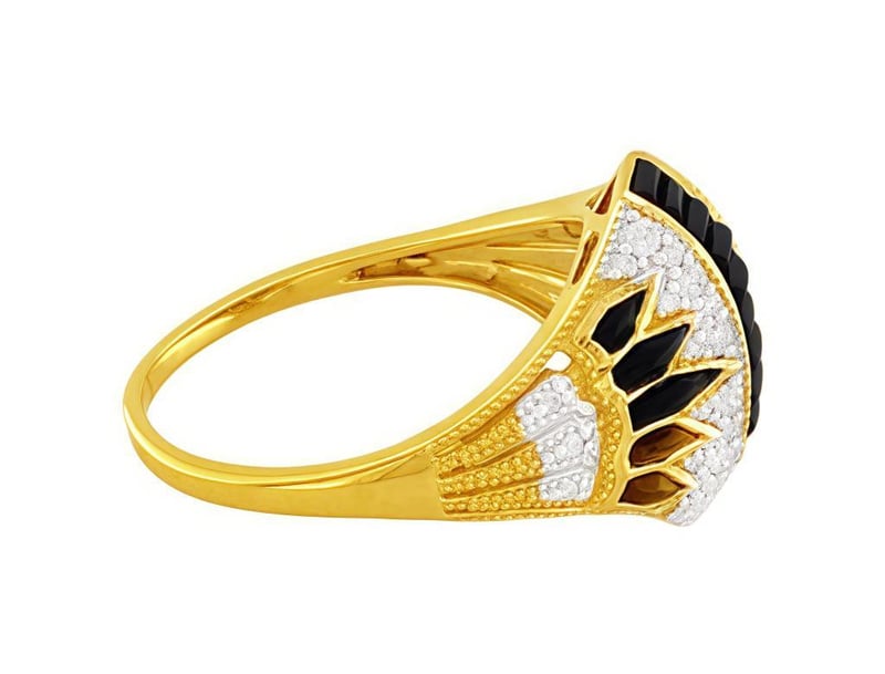 9CT YELLOW GOLD ONYX AND DIAMOND RING Date : 27 -03-2025 Category: Ring Comment: Yellow Gold 9K Natural Onyx : 0.81 Carat Natural Diamond : 0.23 Carat Item Weight : 2.77 G Condition: Good - Refer Images 13232 488285+13232