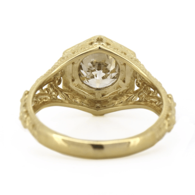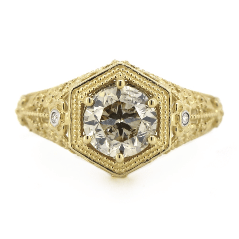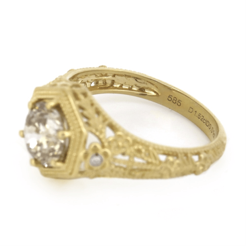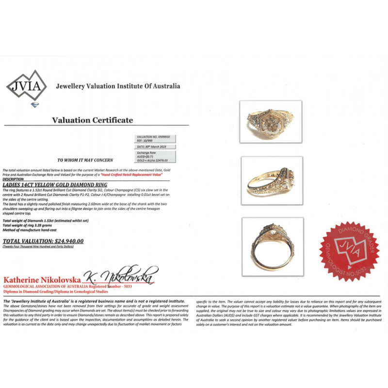 14K YELLOW GOLD, CHAMPAGNE DIAMOND, ART DECO INSPIRED RING. The Centre Features, One Round Brilliant Cut, Champagne, Diamond (1.52Ct, C5 Colour, Si2 Clarity), 6 Claw Set. Decorating The Shoulders Are, 2 Round Brilliant Cut, Champagne, Diamonds (0.01Ct Tdw, J-K Colour, P1-P2 Clarity), Bezel Set. Ring Size M. Valuations Provided by an Independent Third-Party Professional Not Directly Associated With Lloyds Auctions at AUD $$24,940.00This valuation has been conducted by an independent third-party professional. The valuation amount is an assessment by the issuing valuer and does not reflect the auction value of the item. Any inquiries regarding the valuation should be directed to the issuing valuer (refer to contact details on the certificate), as Lloyds Auctions has no affiliation or influence over the valuation, the valuer, or the stated amount. Condition: Good - Refer Images 0645845+1509