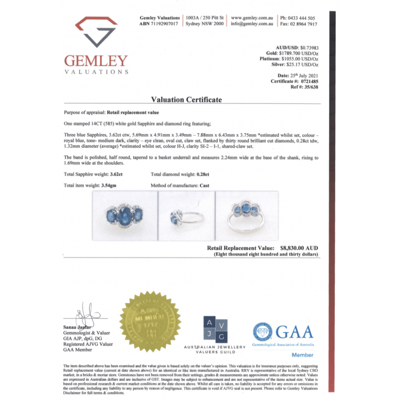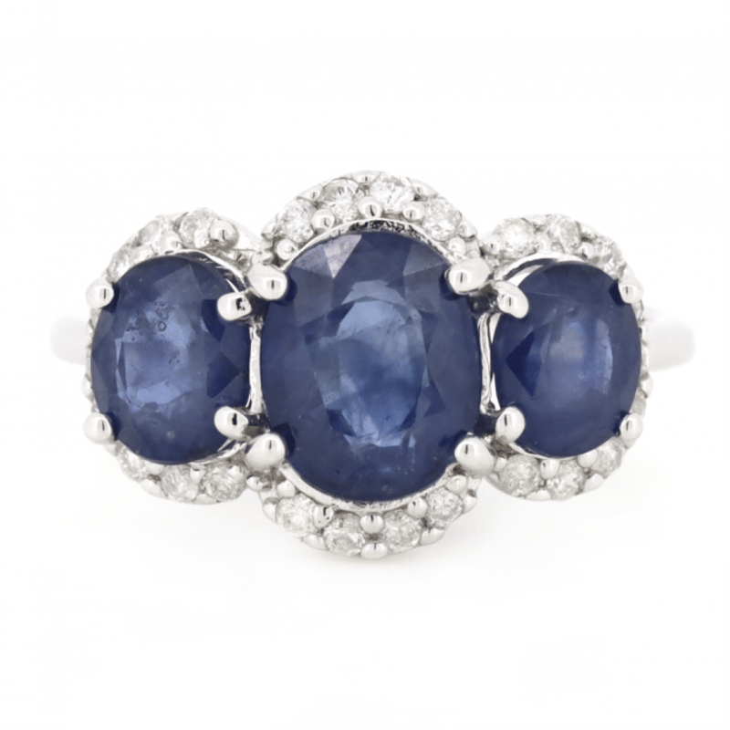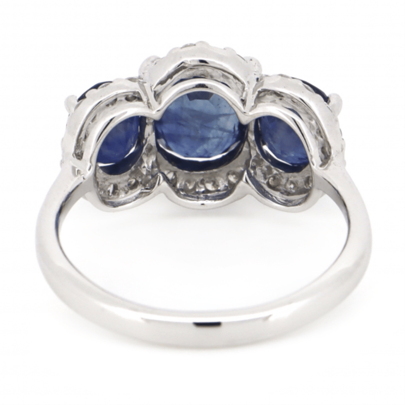 The Design Features, 3 Oval Cut, Royal Blue, Sapphires (3.62Ct Tsw, Eye Clean Clarity), Claw Set. Surrounding The Design In A Halo Are, 30 Round Brilliant Cut, Diamonds (0.28Ct Tdw, H-J Colour, Si2-I1 Clarity), Shared Claw Set. Ring Size L 1/2.