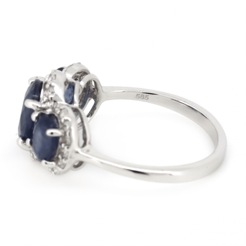 14K WHITE GOLD, BLUE SAPPHIRE AND DIAMOND, HALO TRILOGY RING.
