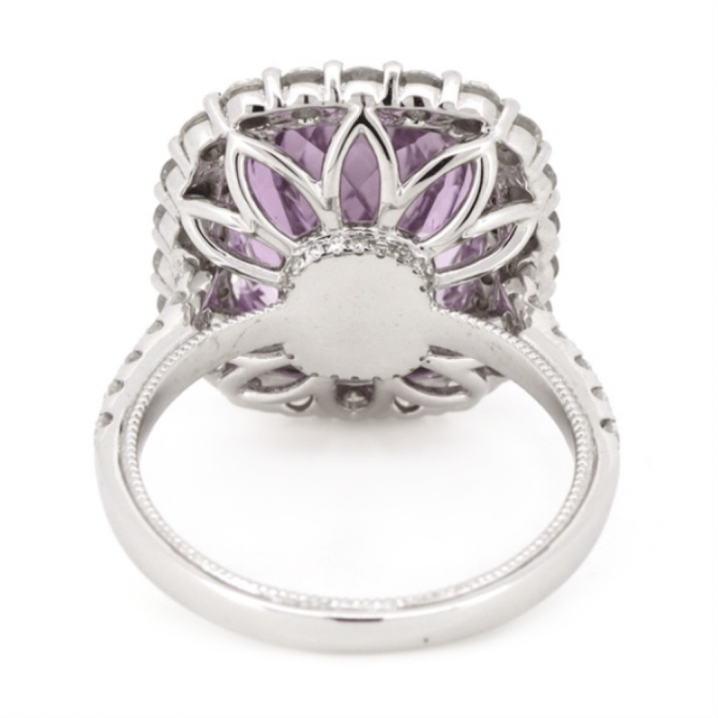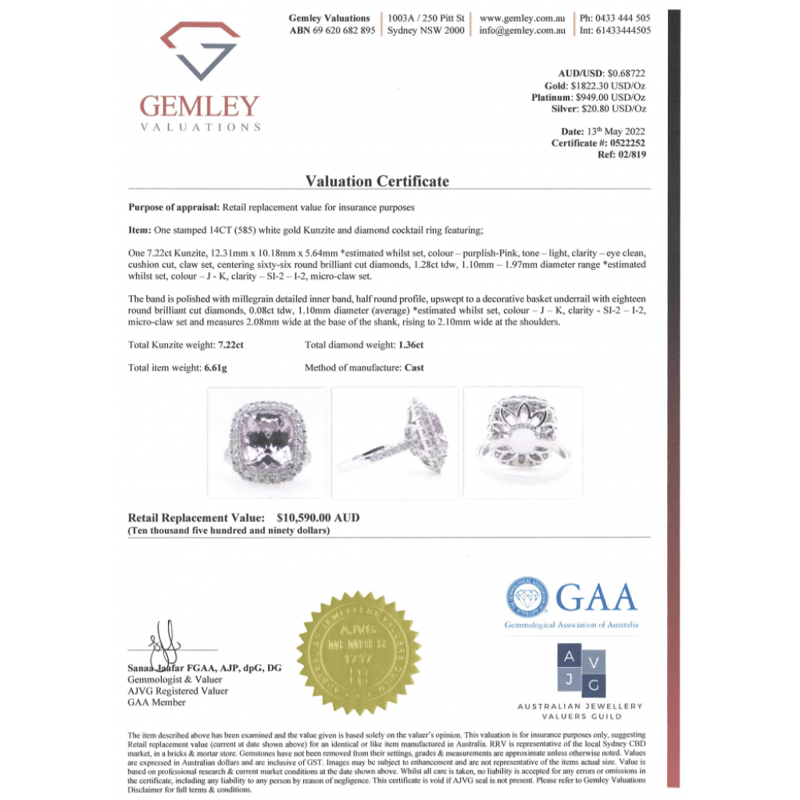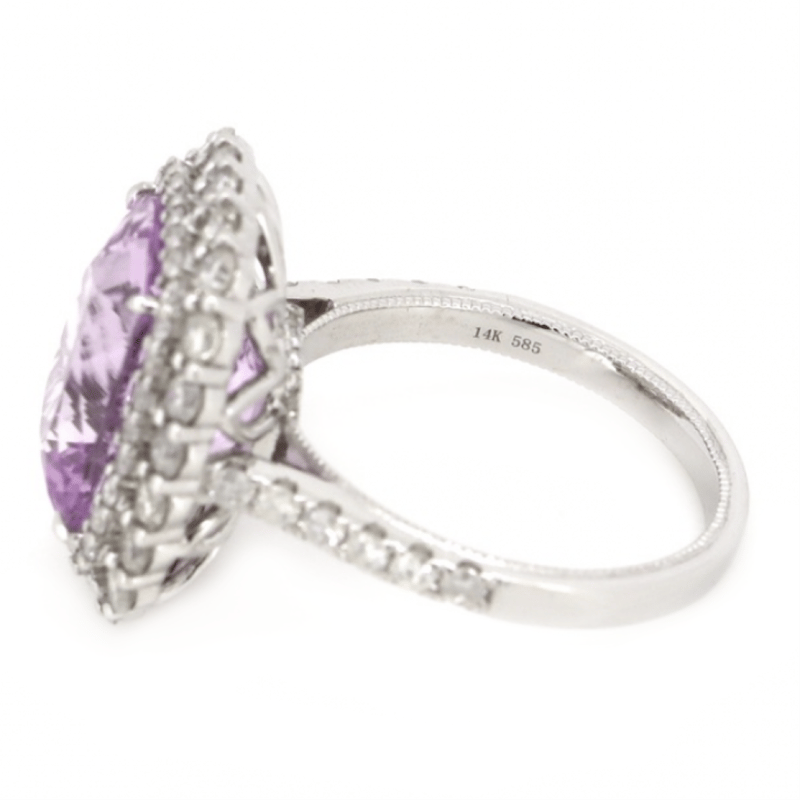 The Centre Features, One Cushion Cut, Light Purplish-Pink, Kunzite (7.22Ct, Eye Clean Clarity), Claw Set. Surrounding The Centre In A Double Halo And Decorating The Band Are, 84 Round Brilliant Cut, Diamonds (1.36Ct Tdw, J-K Colour, Si2-I2 Clarity), Micro-Claw Set. Ring Size M.