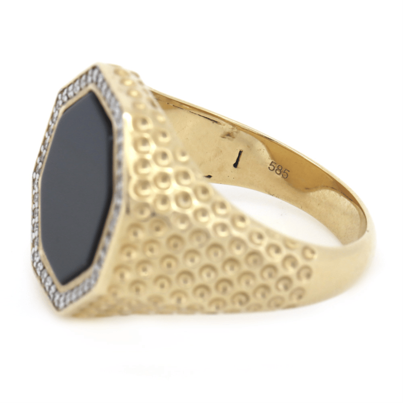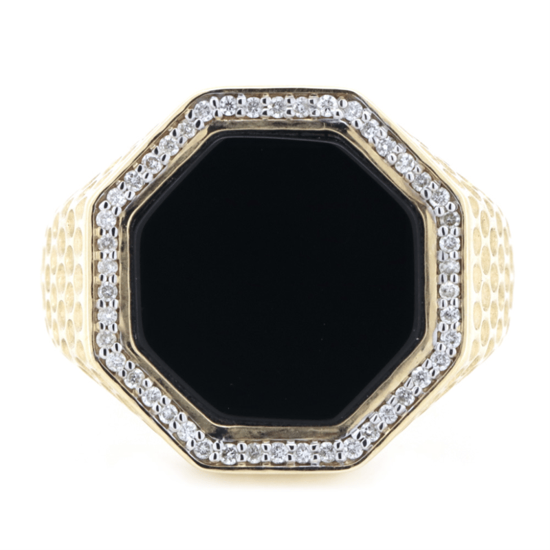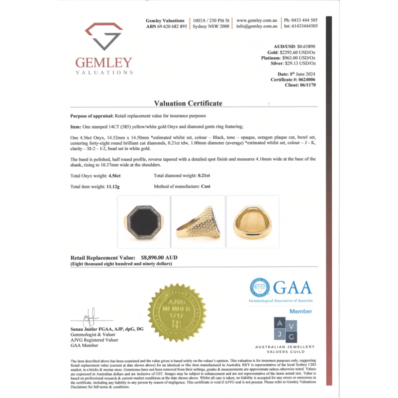 14K YELLOW GOLD, BLACK ONYX AND DIAMOND, GENTS RING. The Centre Features, One Octagon Plaque Cut, Black, Onyx (4.56Ct, Opaque), Bezel Set. Bordering The Centre Are, 48 Round Brilliant Cut, Diamonds (0.21Ct Tdw, J-K Colour, Si2-I2 Clarity), Bead Set In White Gold. Ring Size U. Valuations Provided by an Independent Third-Party Professional Not Directly Associated With Lloyds Auctions at AUD $$8,890.00This valuation has been conducted by an independent third-party professional. The valuation amount is an assessment by the issuing valuer and does not reflect the auction value of the item. Any inquiries regarding the valuation should be directed to the issuing valuer (refer to contact details on the certificate), as Lloyds Auctions has no affiliation or influence over the valuation, the valuer, or the stated amount. Condition: Good - Refer Images 0645845+1567